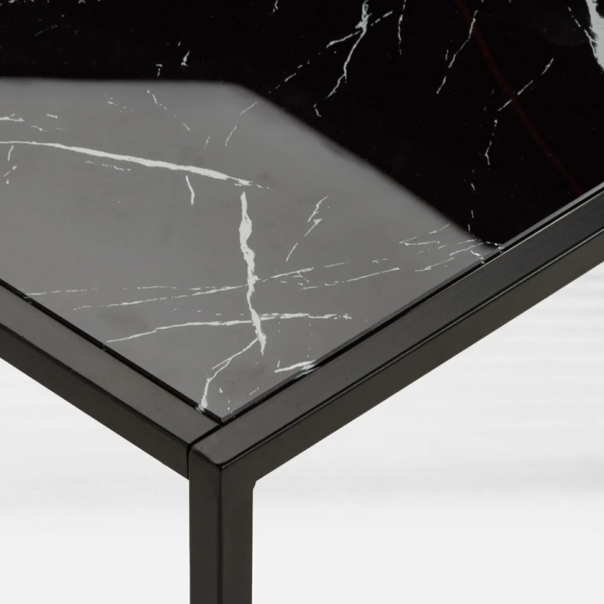 - Blat z hartowanego szkła – blat wykonano ze szkła hartowanego, który imituje marmur w eleganckim czarnym odcieniu.
