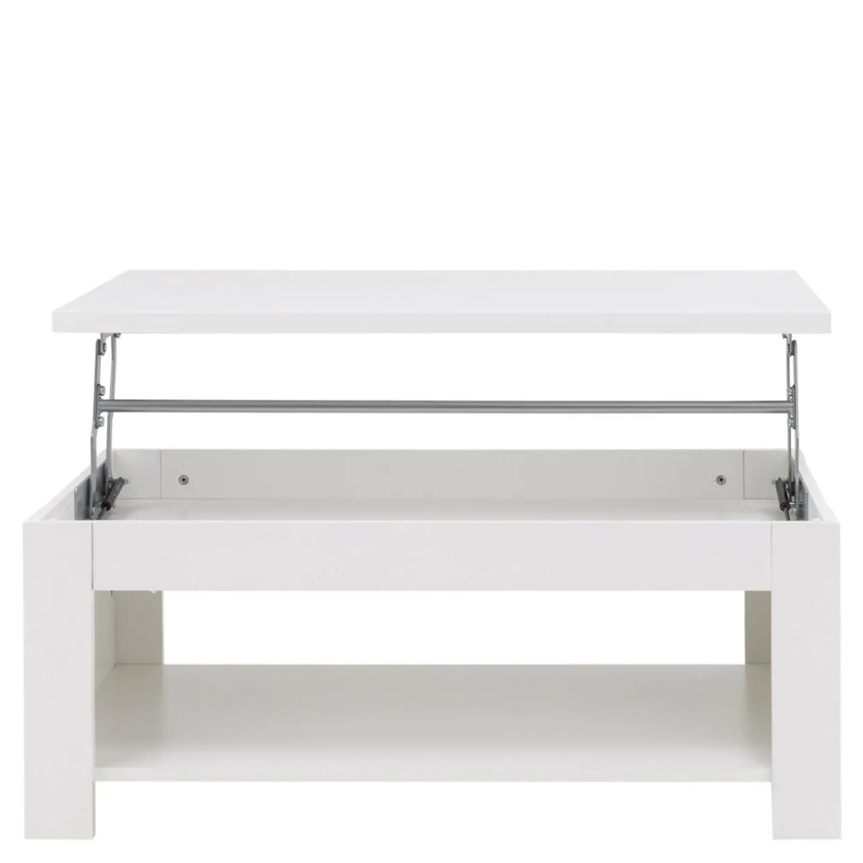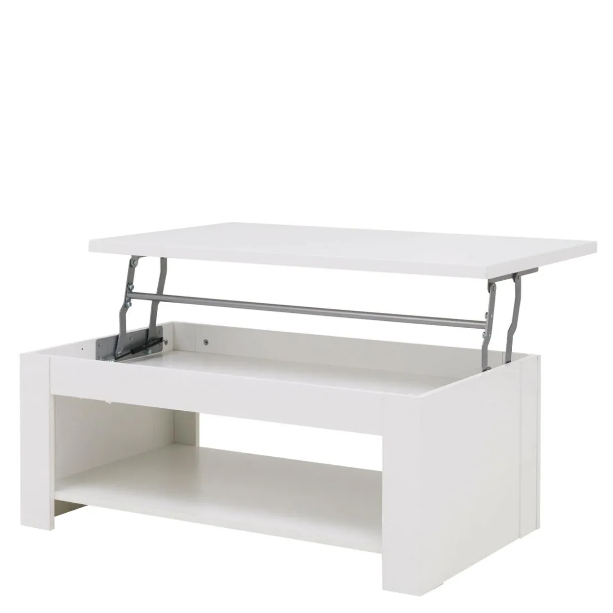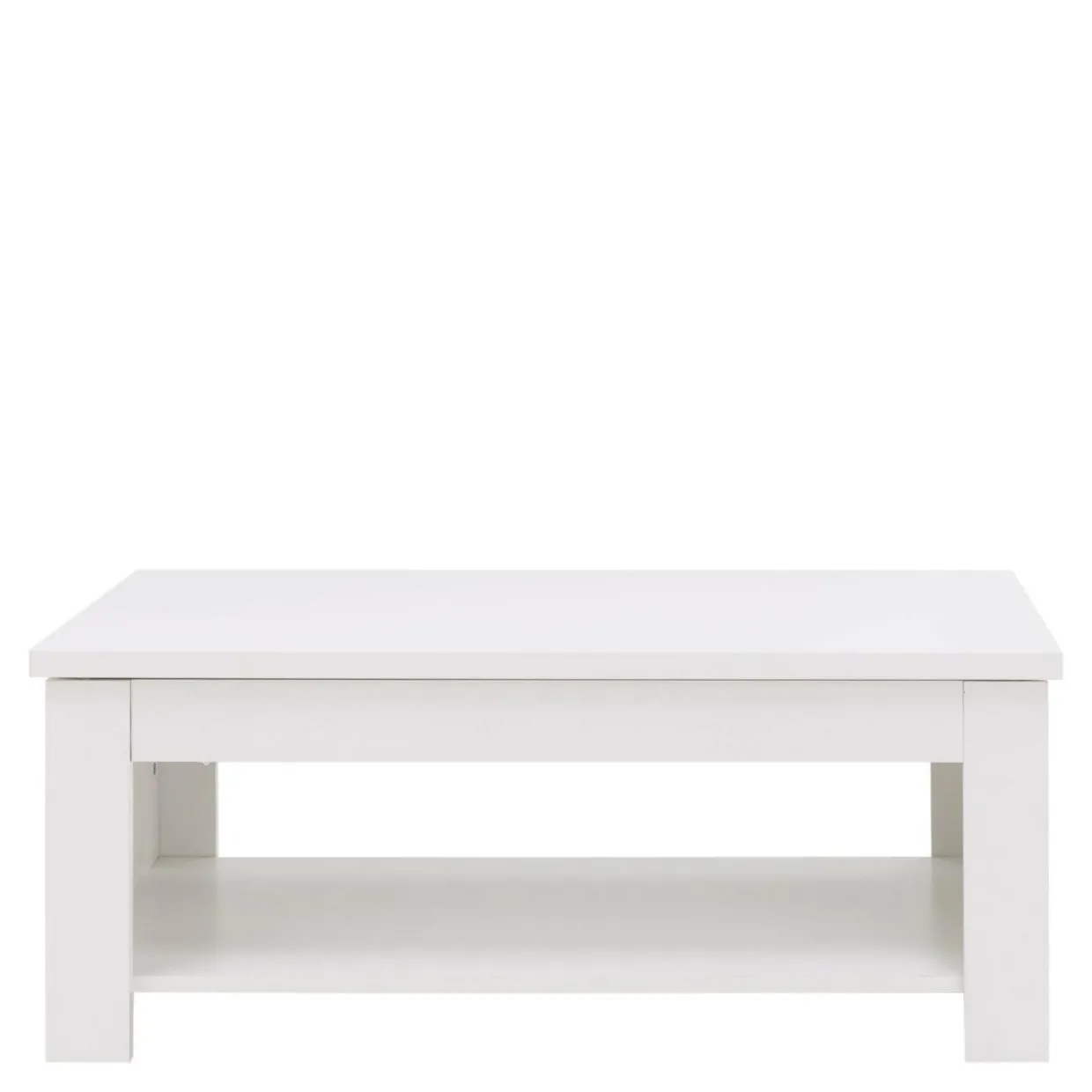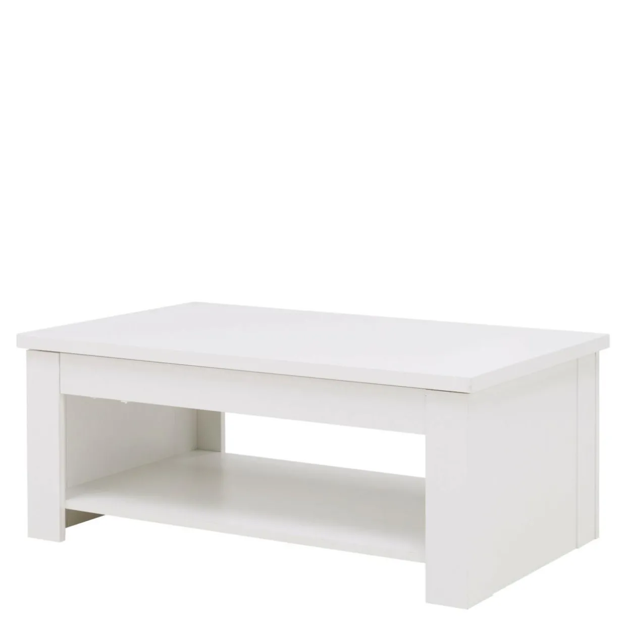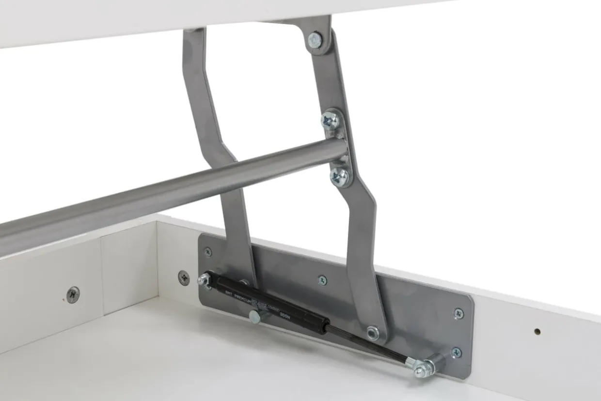 Atutem stolika jest jego ciekawa konstrukcja z podnoszonym ku górze blatem. Dzięki temu rozwiązaniu wzrasta wysokość mebla, tworzą się dwie użytkowe płaszczyzny, oraz praktyczna skrytka we wnętrzu mebla. Pod prostokątnym blatem znajduje się również półka.
