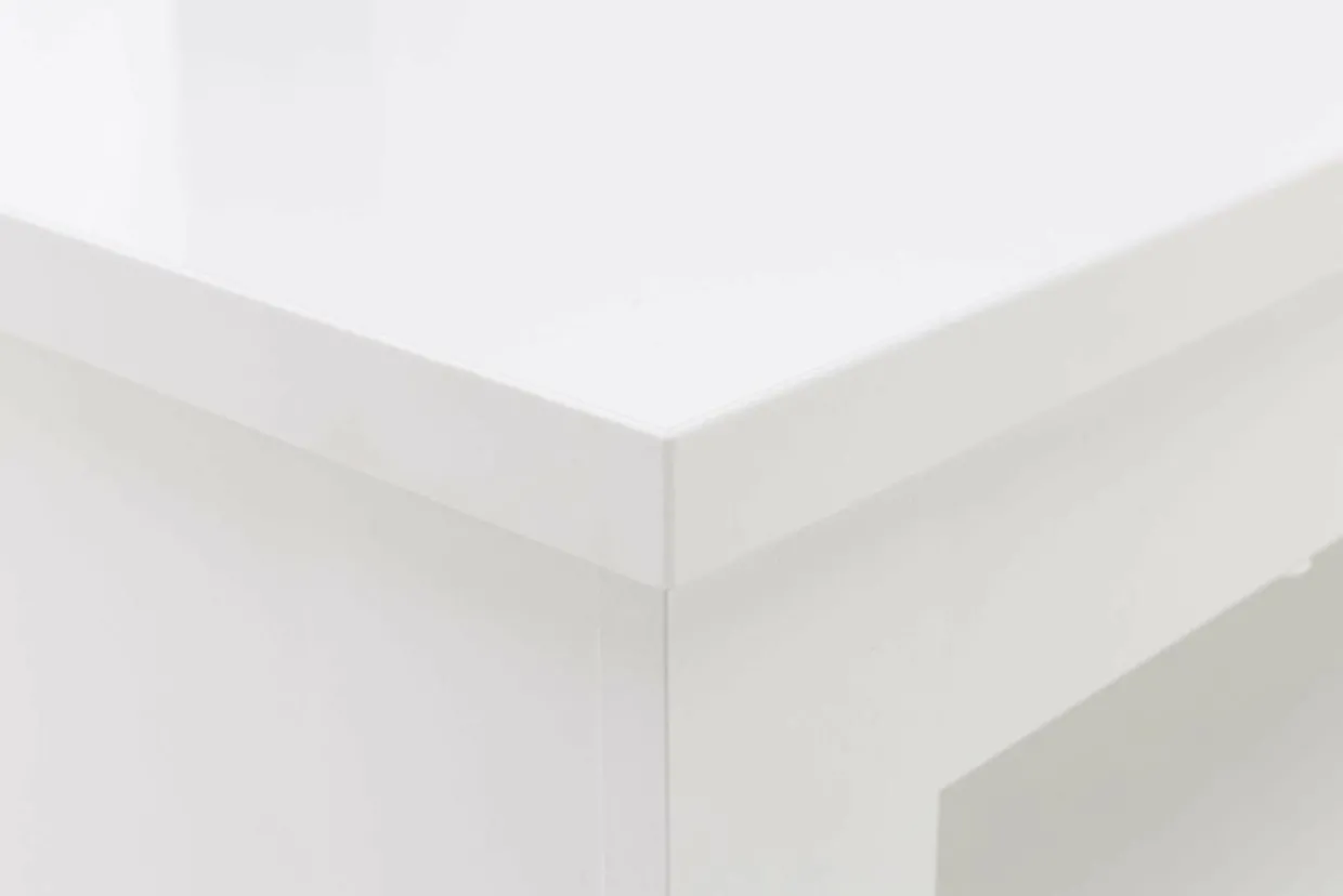 Na stoliku można na nim ustawić dodatki dekoracyjne, takie jak wazon z kwiatami lub ozdobne bibeloty. Biała kolorystyka sprawia, że stolik idealnie pasuje do jasnych, przestronnych, pełnych światła wnętrz. Doskonale komponuje się z żywymi kolorami oraz dodatkami przyozdobionymi srebrem, chromem lub delikatnym drewnianym dekorem.