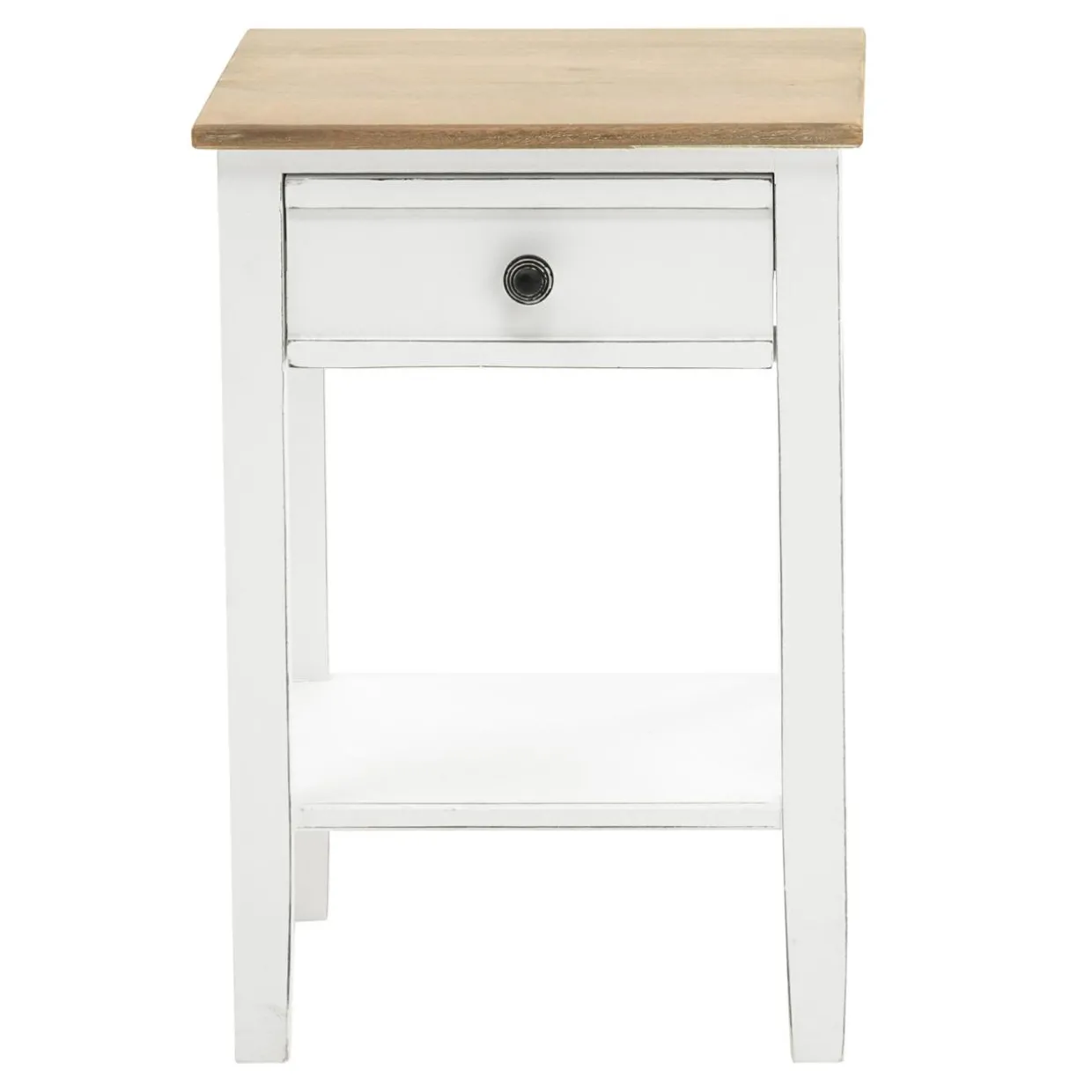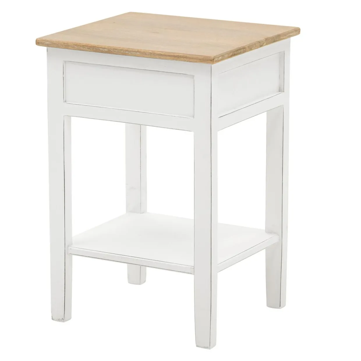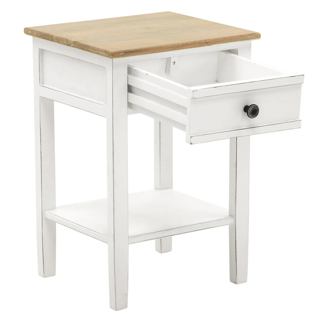 - Stolik wykonano z drewna mango i zabezpieczono białym lakierem z efektem matu. Przecierania sprawiają, że mebel wygląda na postarzany.