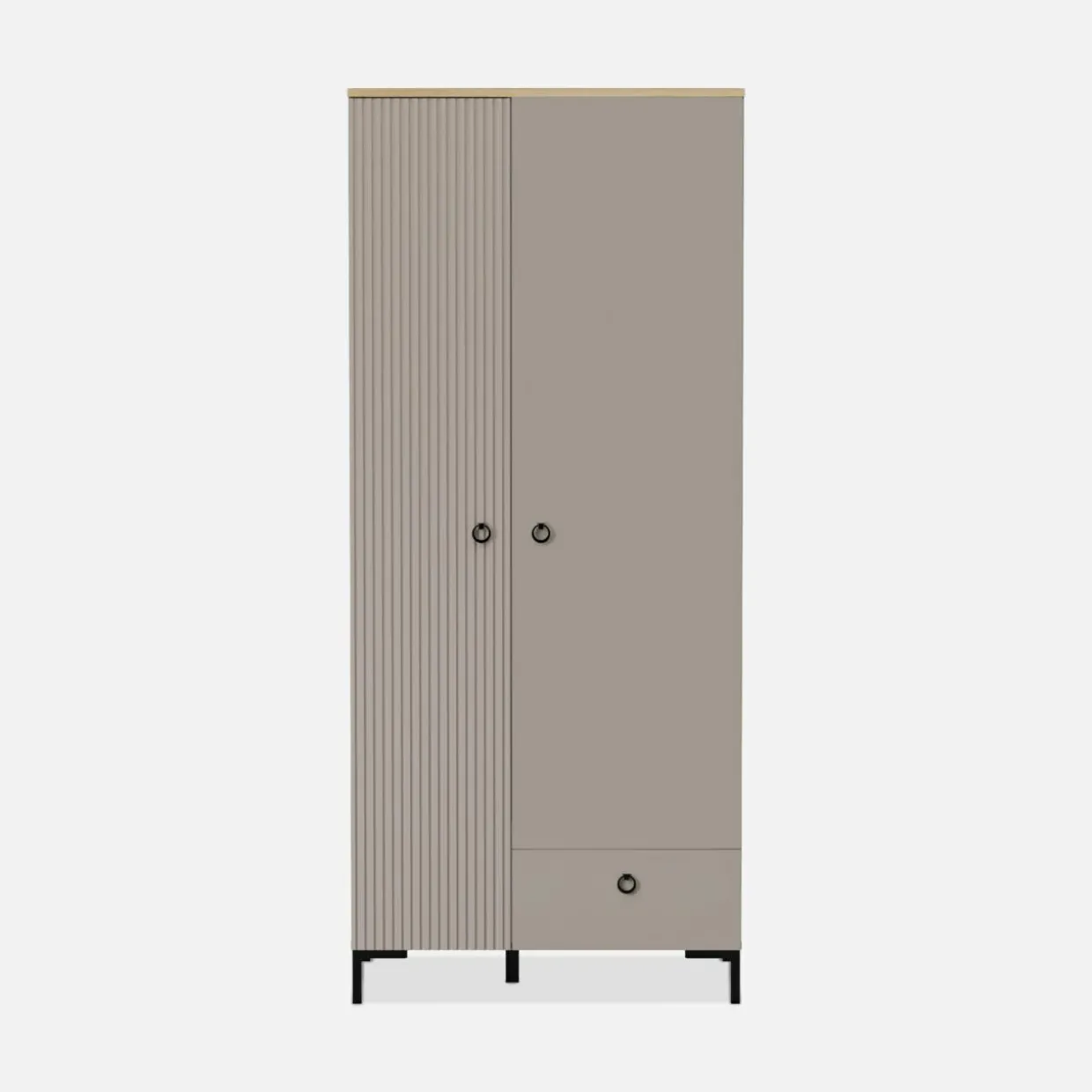 - Ryflowane fronty w kolorze taupe idealnie zgrywają się z korpusami. Wykończone są laminatem i folią.