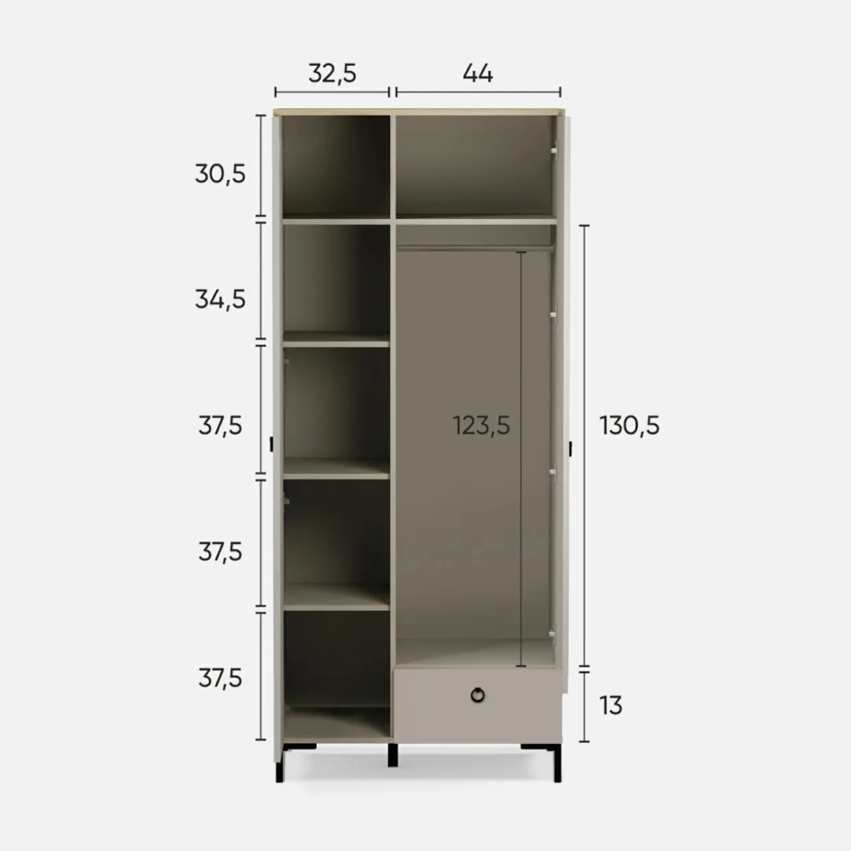 - Korpusy skonstruowane są z laminowanej na kolor taupe płyty meblowej o grubości 16 mm.