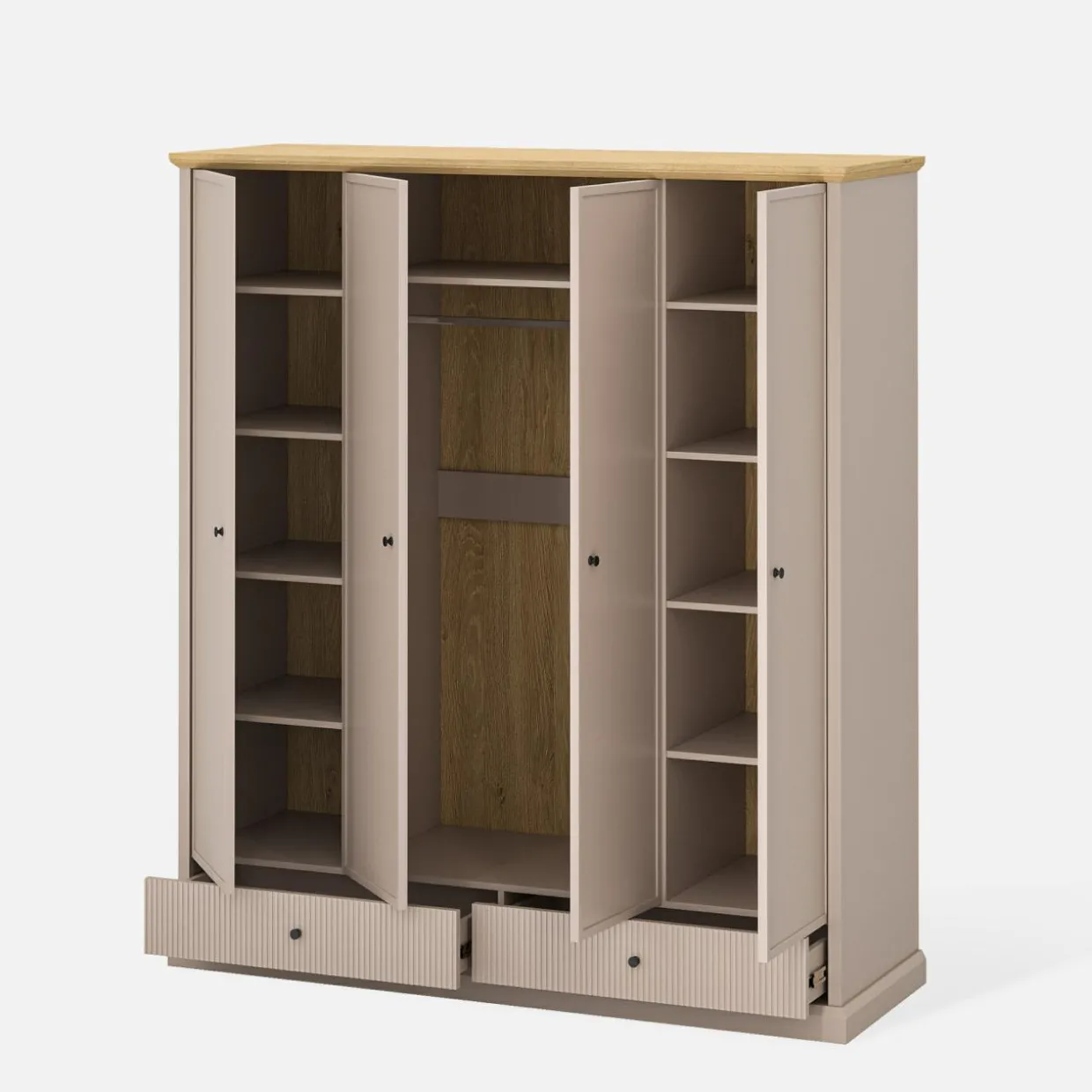 Szafa IDELLO w odcieniach taupe i dębu kamiennego dodaje sypialni elegancji i nowoczesności. Warto zestawić ją z dodatkami w odcieniach szarości, bieli oraz złota, aby podkreślić jej unikalny charakter.
