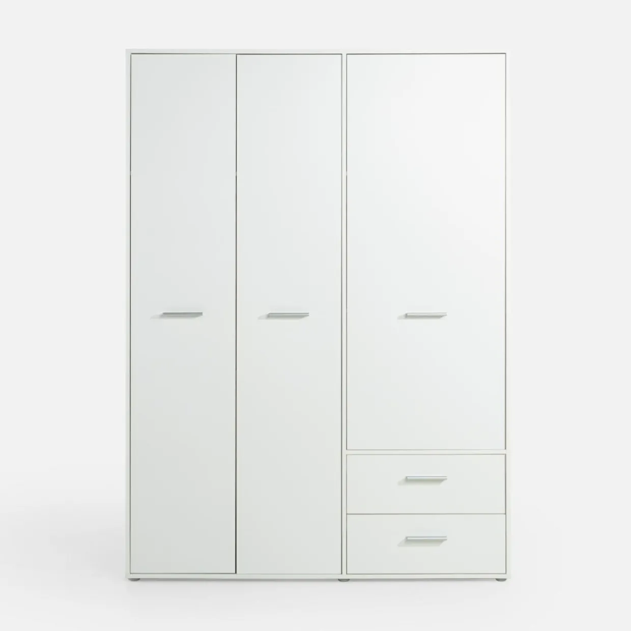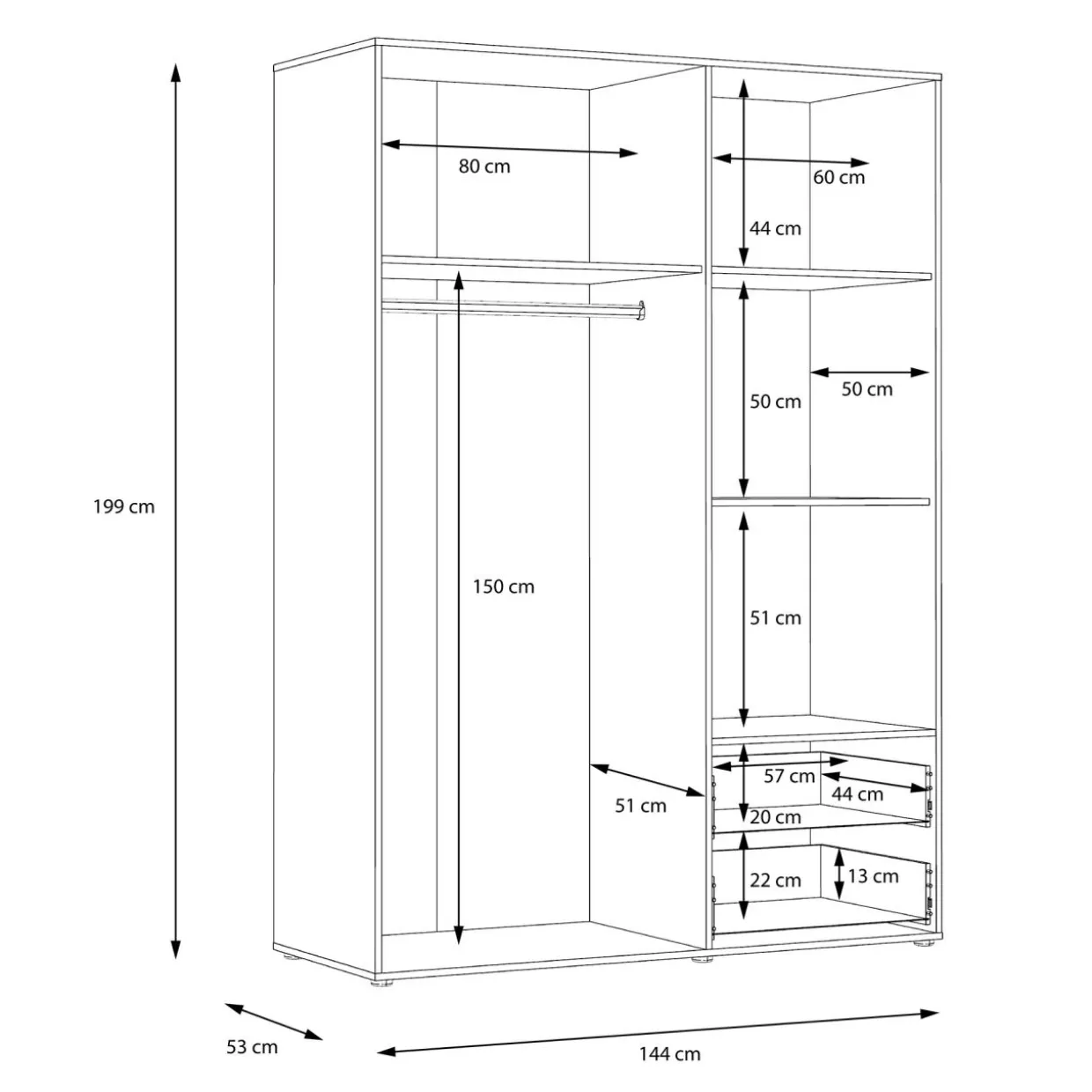 Szafa MINORU ma niecałe 145 cm szerokości więc możesz wpasować ją nawet w niewielki pokój. Zaprojektowano ją w taki sposób, by przechowywać w niej odzież zarówno na wieszakach, na półkach, jak i w szufladach.