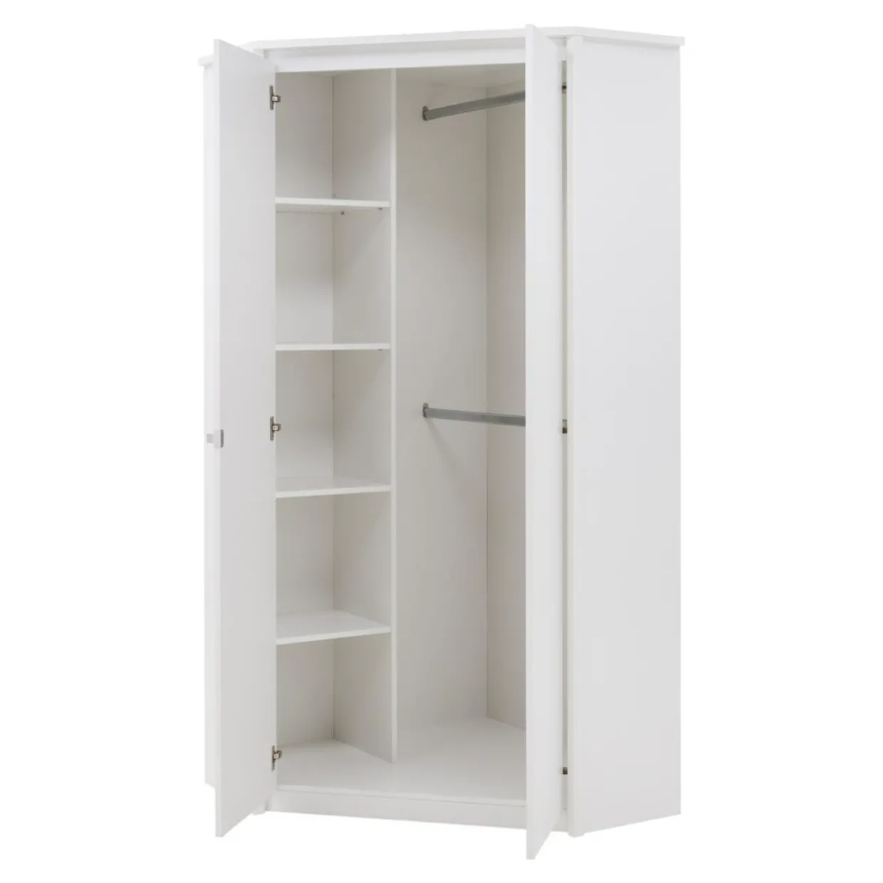 Otwierana w tradycyjne sposób narożna szafa znacznie oszczędza miejsce w pokoju, w zamian dając dużą przestrzeń na komfortowe rozmieszczenie garderoby.