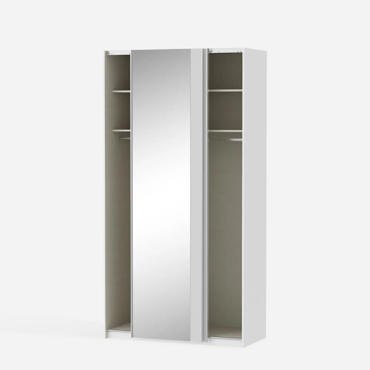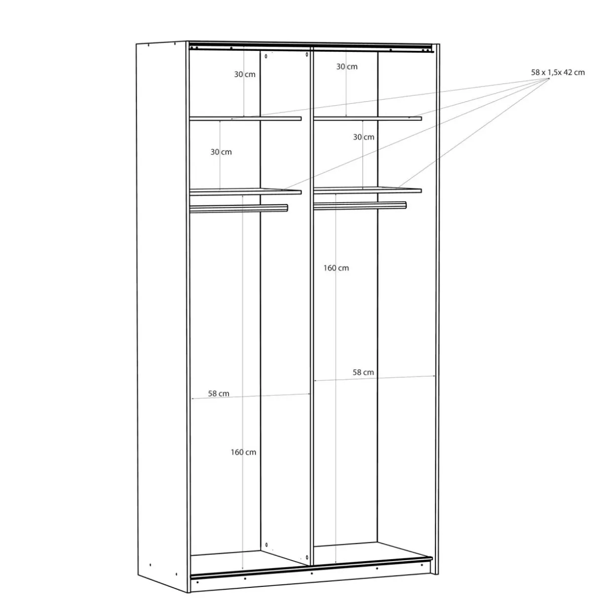 - Podzielona na dwie części — równomierne ułożenie półek i drążków w szafie umożliwia podzielenie wnętrza na różne sposoby; osobna część dla Ciebie i partnera lub dwójki rodzeństwa.