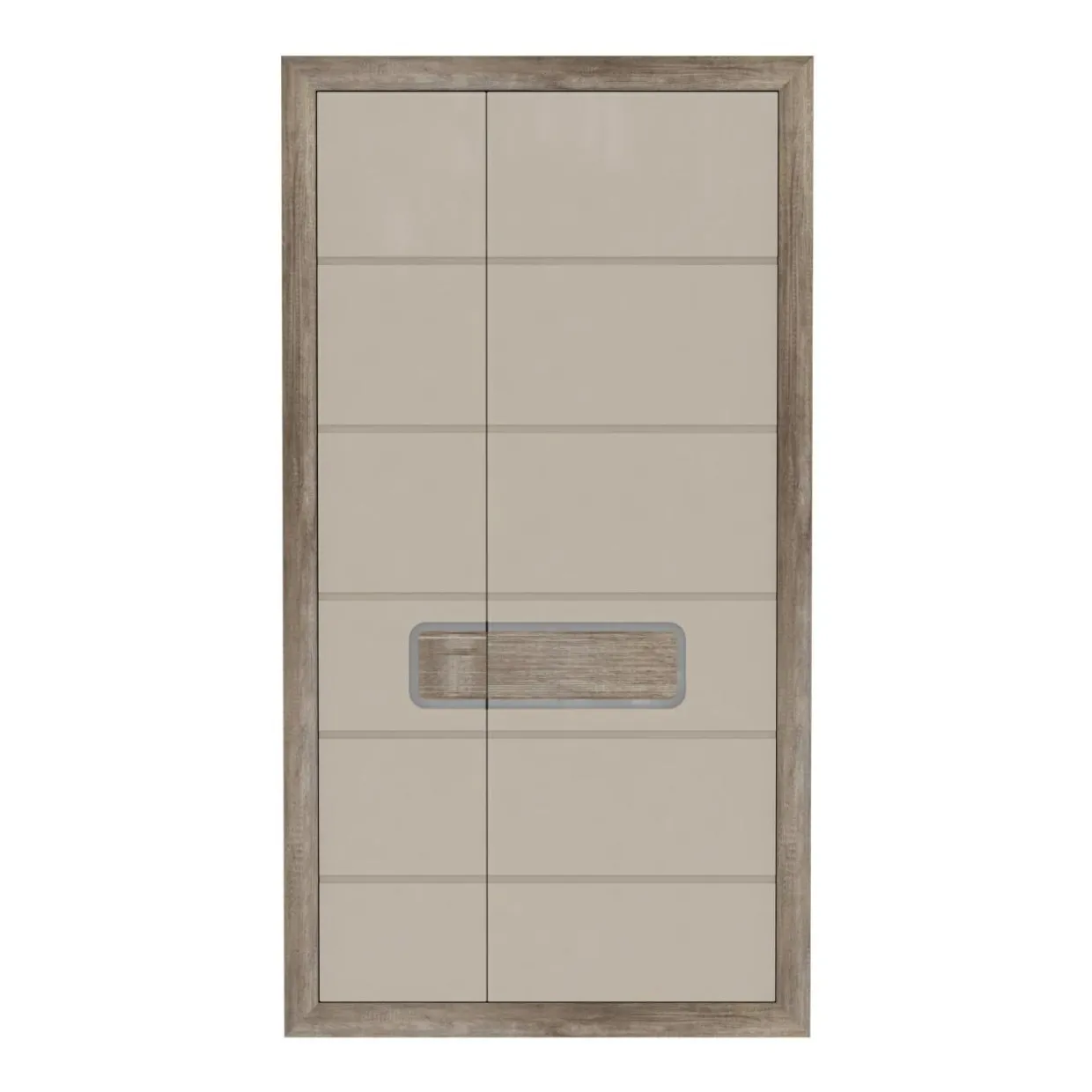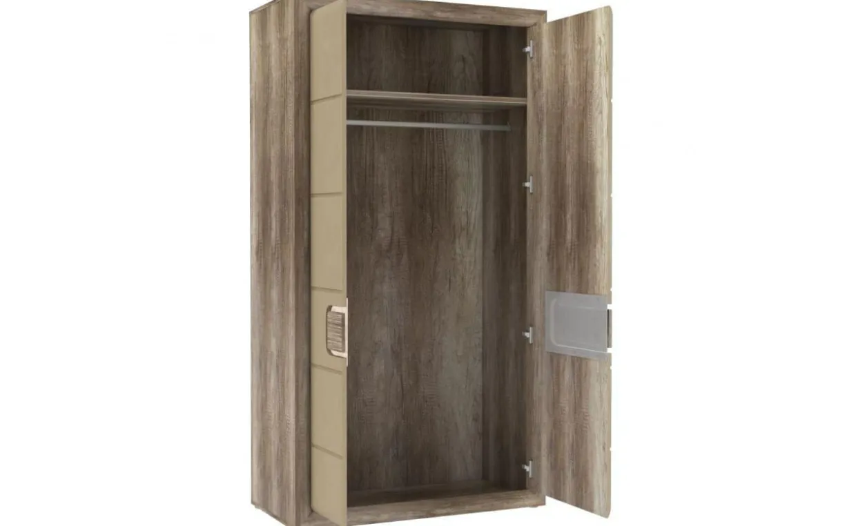 Szafa ubraniowa o nietuzinkowym wyglądzie, która będzie atrakcyjnym akcentem, a jednocześnie zwiększy funkcjonalność wnętrza. Korpus w kolorze dębu antycznego imitującego usłojenie drewna łączy się z frontami w beżowym połysku. Takie oryginalne wybarwienie świetnie komponuje się z innymi kolorami, więc możliwości tworzenia własnych aranżacji są niemal nieograniczone. To mebel dla osób, które cenią praktyczność połączoną z ciekawym designem. Uchwyty mają formę szerokiej, ryflowanej listwy, co doskonale komponuje się z całością.