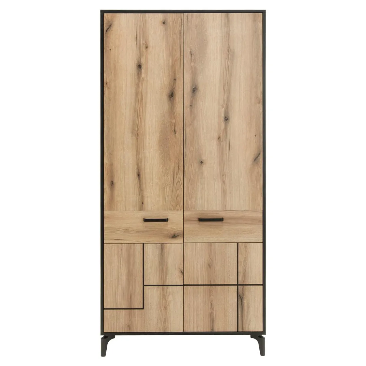 Meble wykonane z płyty meblowej wykończone są laminatem w kolorze czarnym i dąb evoke. Naturalny rysunek drewna z widocznymi sękami i słojami podkreślą przytulną atmosferę.