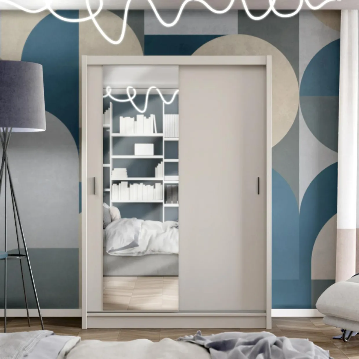 Szafa przesuwna z lustrem NESS o szerokości 150 cm w kolorze kaszmir to praktyczne rozwiązanie do sypialni, garderoby lub przedpokoju.