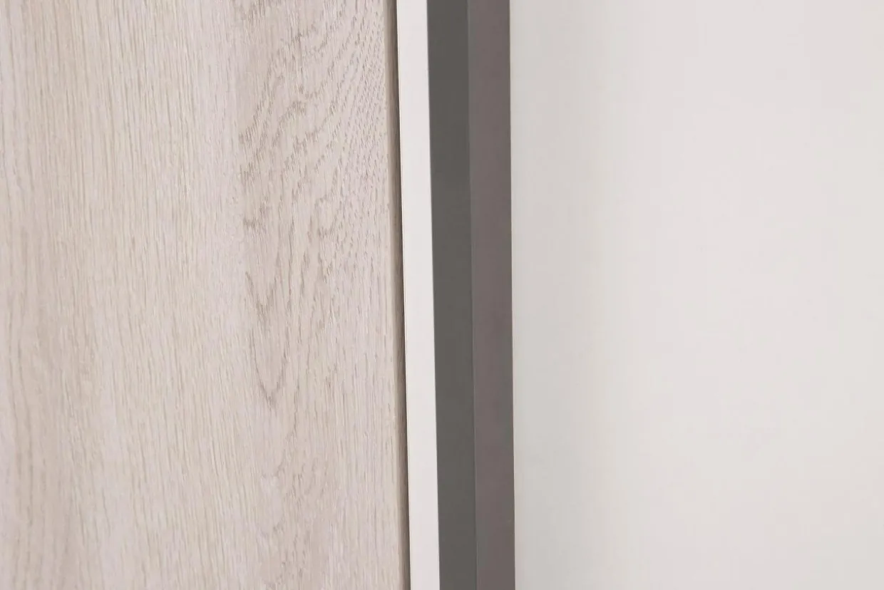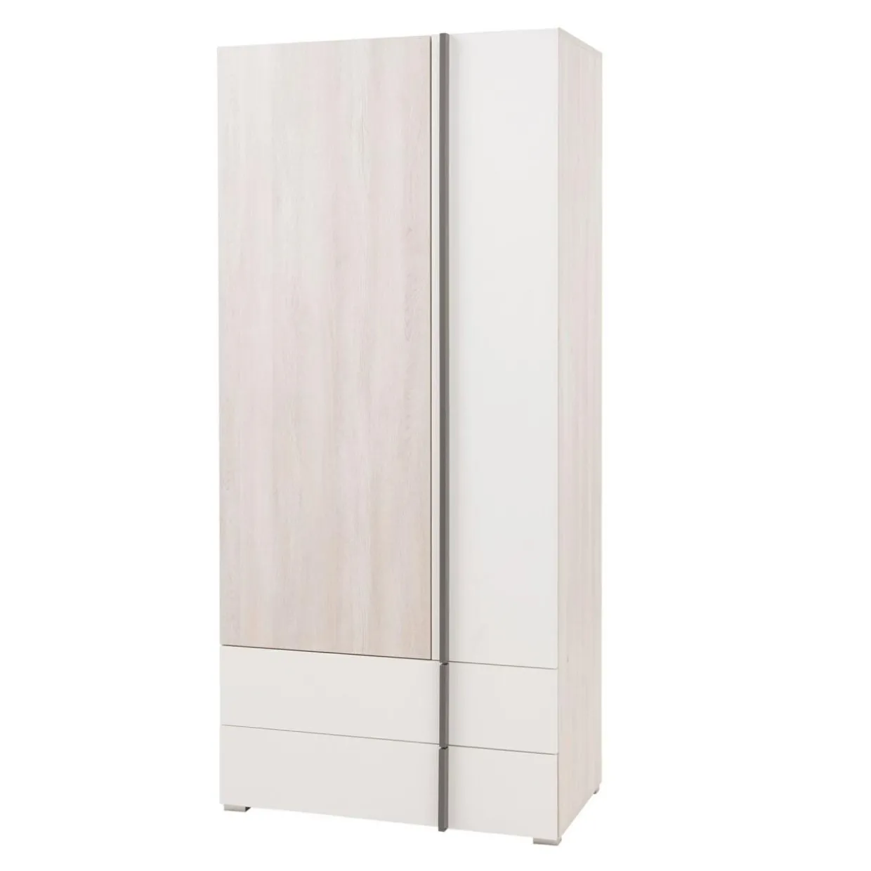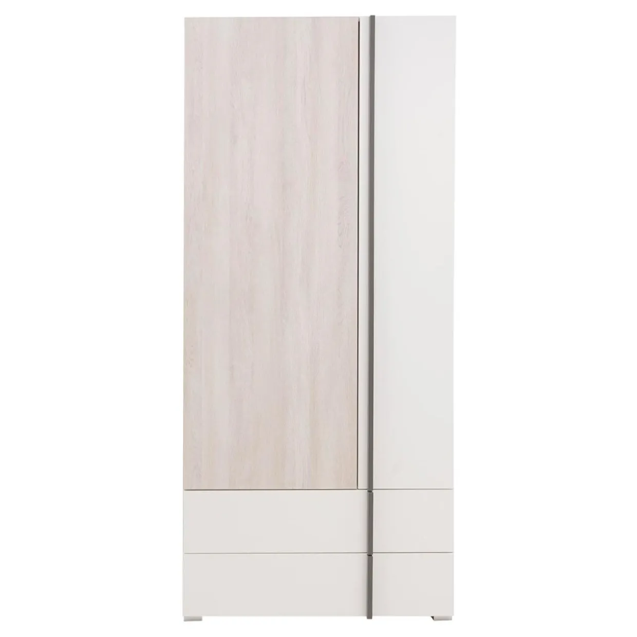- Minimalistyczny, geometryczny wygląd szafa REMO zawdzięcza pokryciu laminatem w kolorze białego matu, białego dębu Wilton i szarości.
