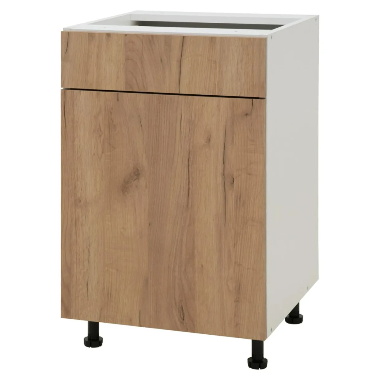 Front zamykanej szafki BASIC PLUS BP/D50S1 został wykończony w kolorze dąb craft złoty. Jego kolorystyka dodaje ciepła i naturalności oraz rozjaśnia optycznie przestrzeń. Świetnie wygląda w połączeniu zarówno z ciepłym, jak i z chłodnym wnętrzem, a charakterystyczna dla dębu faktura drewna dodaje całości elegancji.