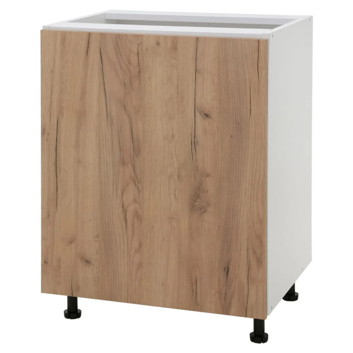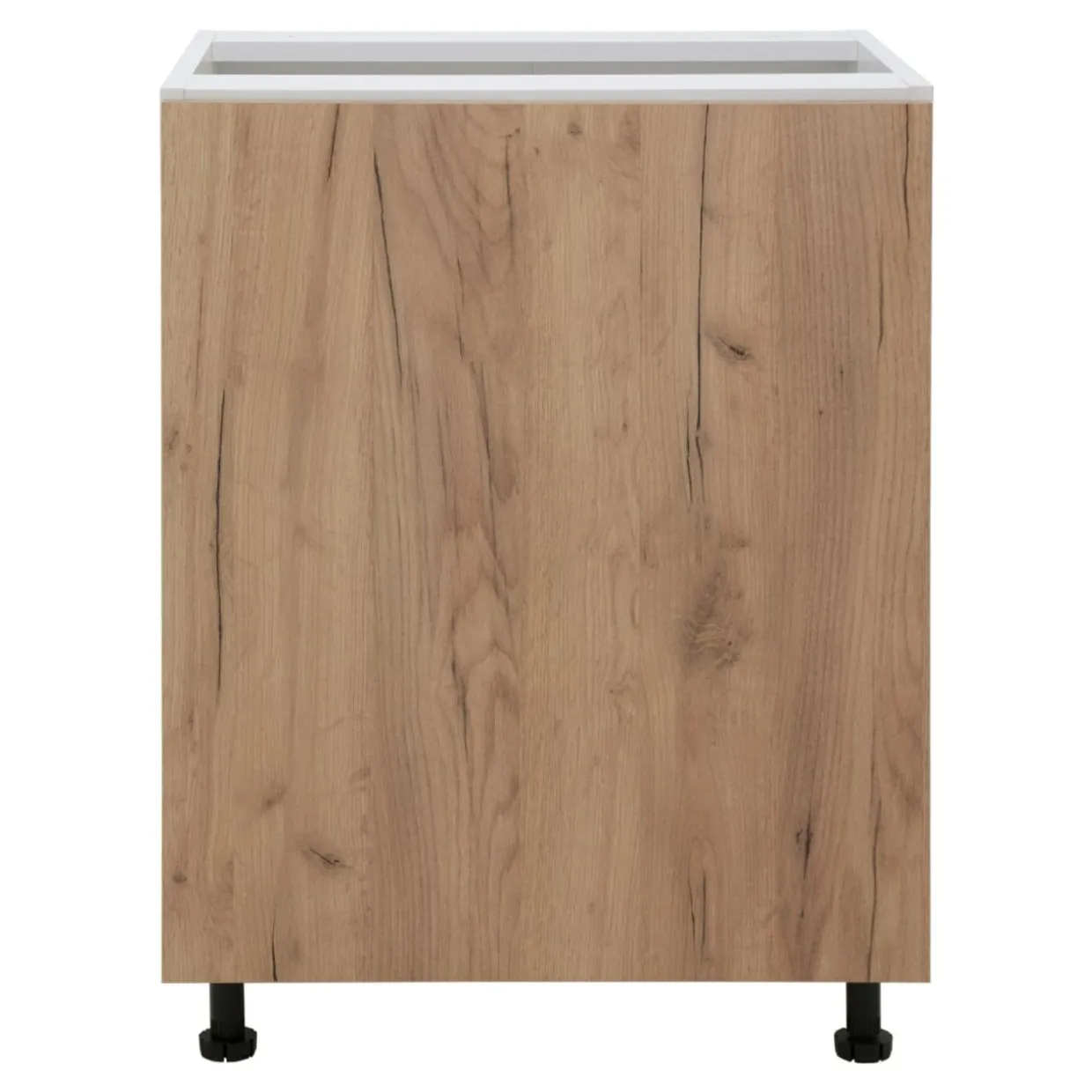 Front zamykanej szafki BASIC PLUS BP/D60 został wykończony w kolorze dąb craft złoty. Jego kolorystyka dodaje ciepła i naturalności oraz rozjaśnia optycznie przestrzeń. Świetnie wygląda w połączeniu zarówno z ciepłym, jak i z chłodnym wnętrzem, a charakterystyczna dla dębu faktura drewna dodaje całości elegancji.