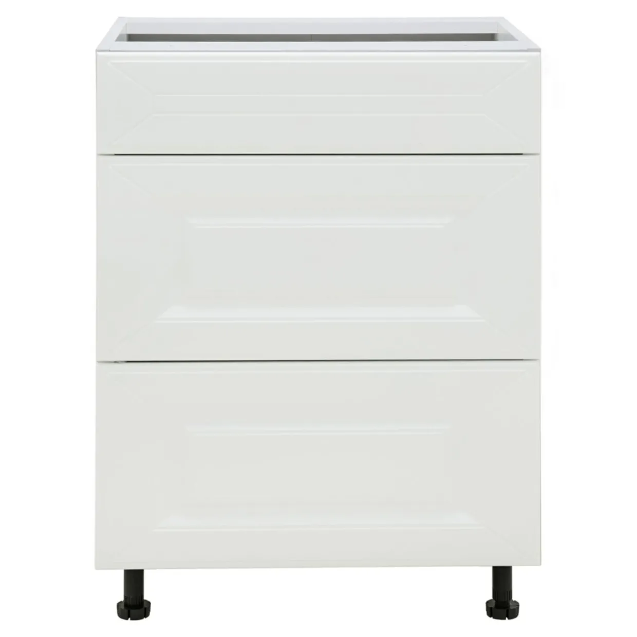 Front zamykanej szafki BASIC PLUS BP/D60S3 został wykończony w matowym odcieniu bieli. Uwagę zwraca charakterystyczna ramka, wewnątrz której umieszczone zostało zdobienie.