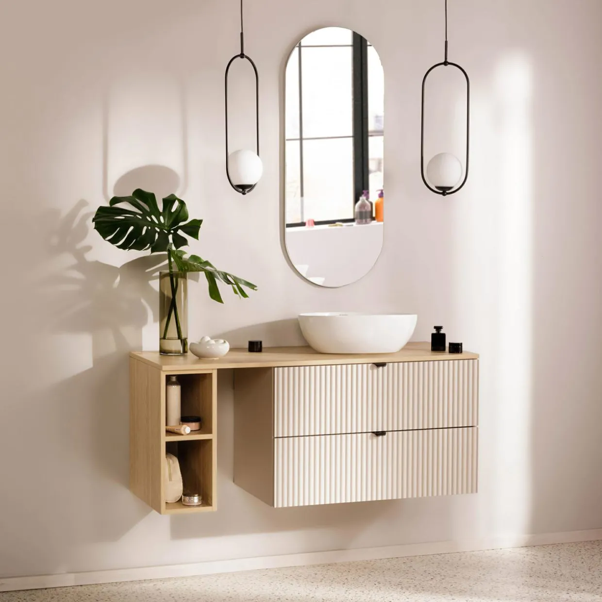 Półka wisząca dedykowana jest do mebli z kolekcji CORTI i BELT. Wykorzystasz ją do zabudowy z szafkami umywalkowymi lub jako dodatkowe miejsce do przechowywania zawieszone wyżej na ścianie.