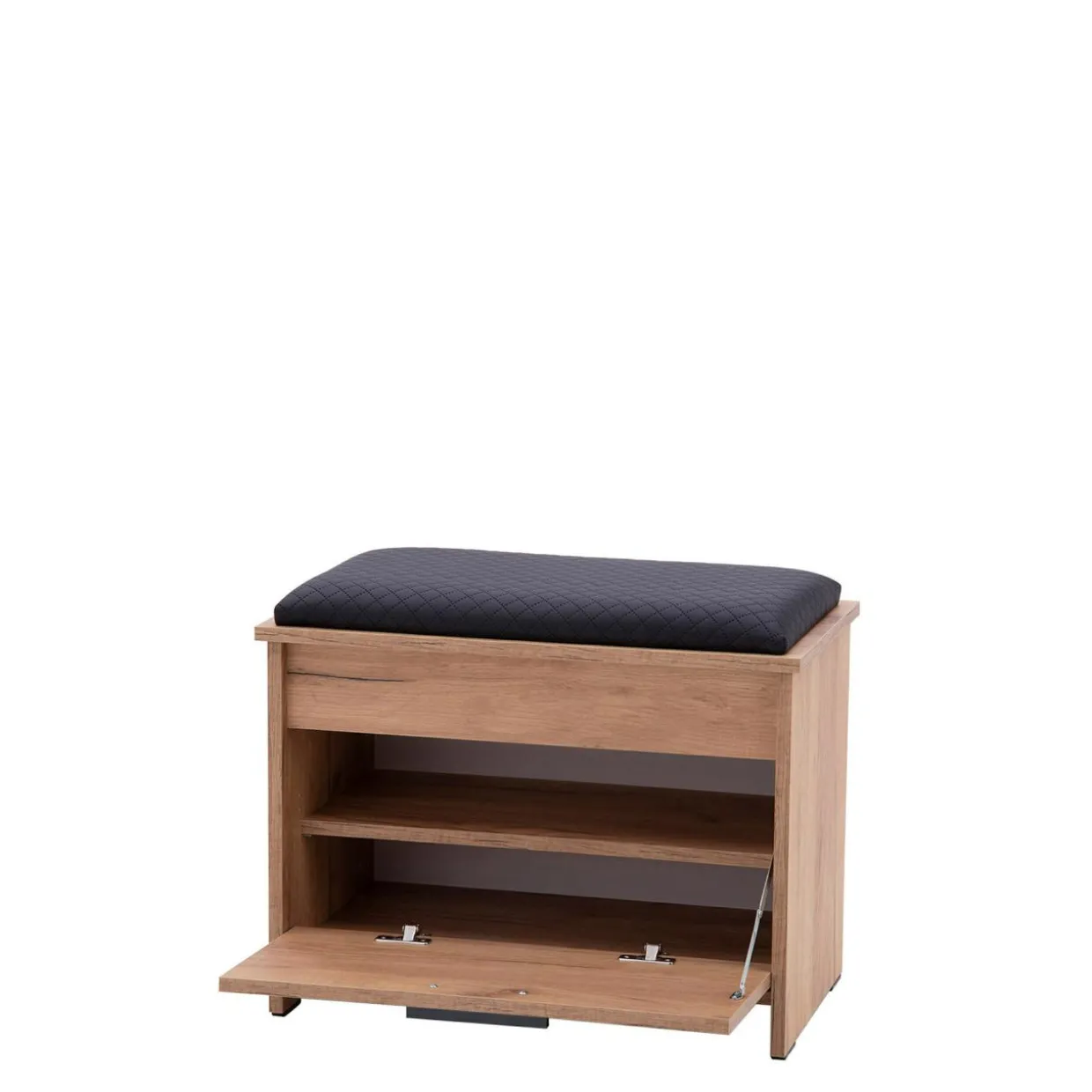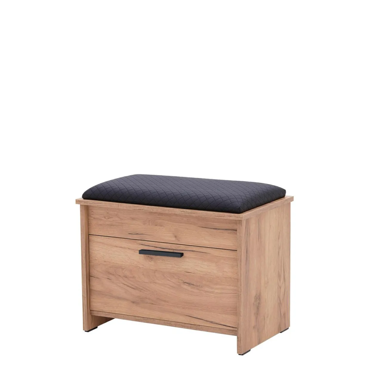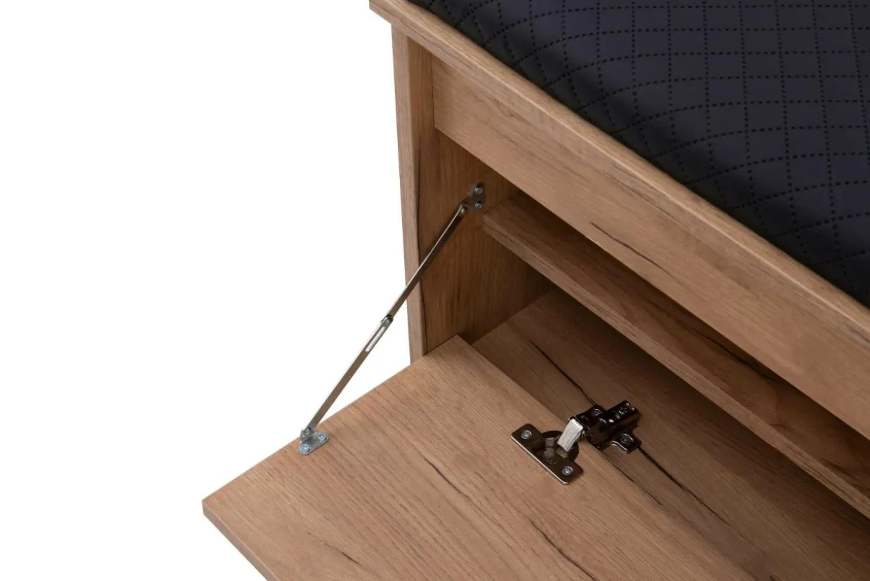 - Tapicerowane siedzisko w ciemnym kolorze dodaje szafce szyku klasycznej elegancji i wpasuje się w wiele rozwiązań aranżacyjnych przedpokoju.