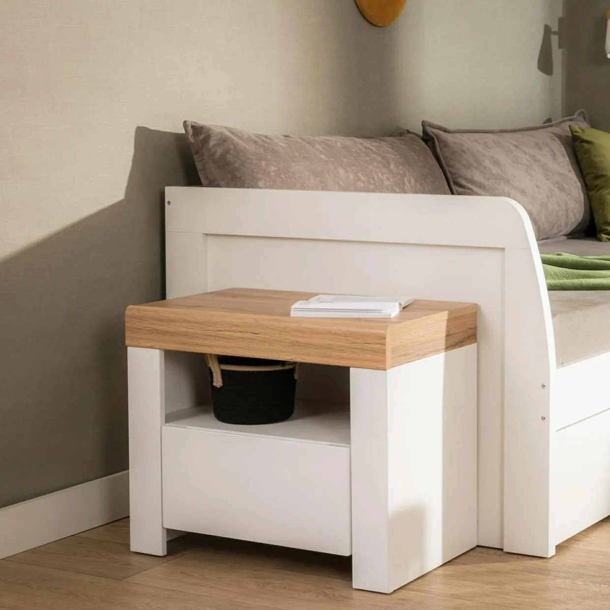 - Leki bezpieczne i pod ręką — schowane w szufladzie unikną kurzu i zabrudzeń, a gdy przyjdzie czas na połknięcie tabletki wystarczy wychylić się z łóżka.