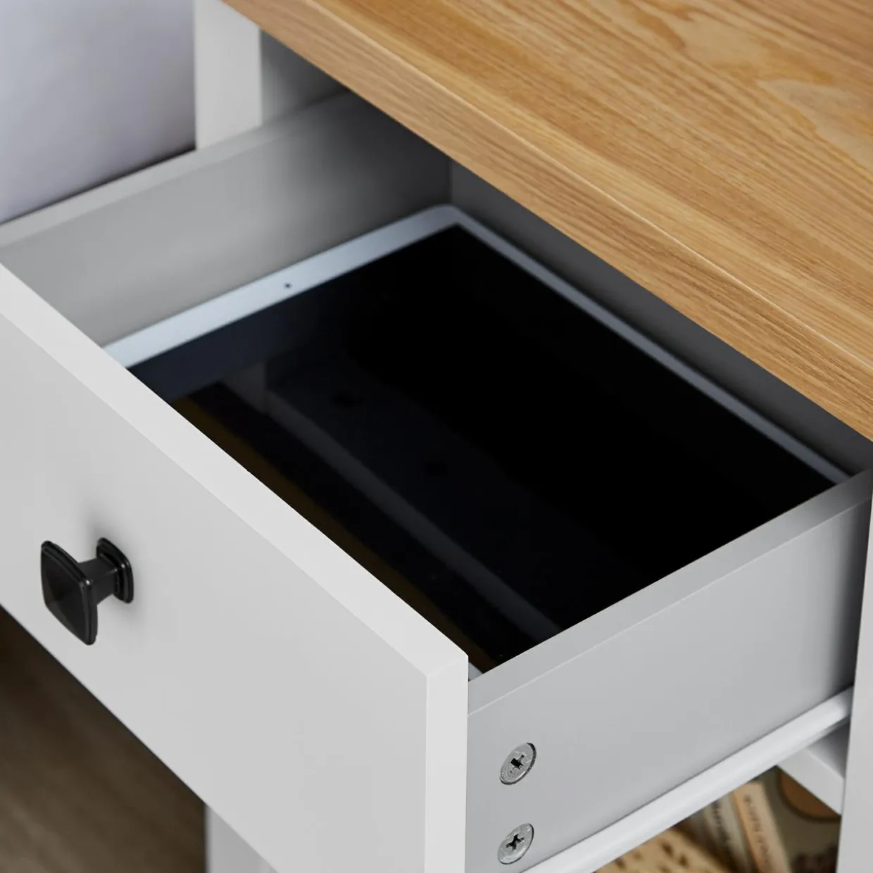 - Na blacie postawisz lampkę nocną i odstawisz szklankę z wodą.