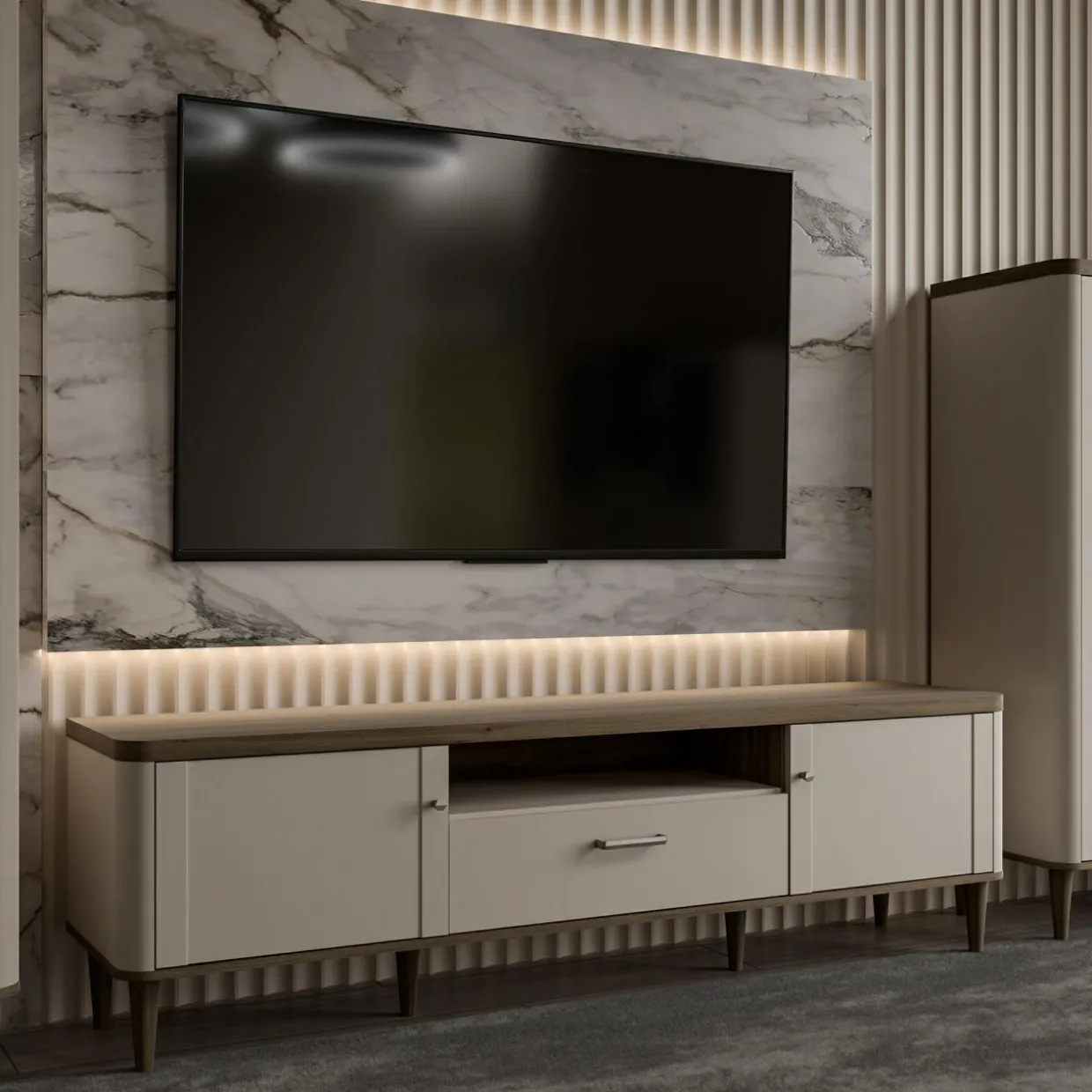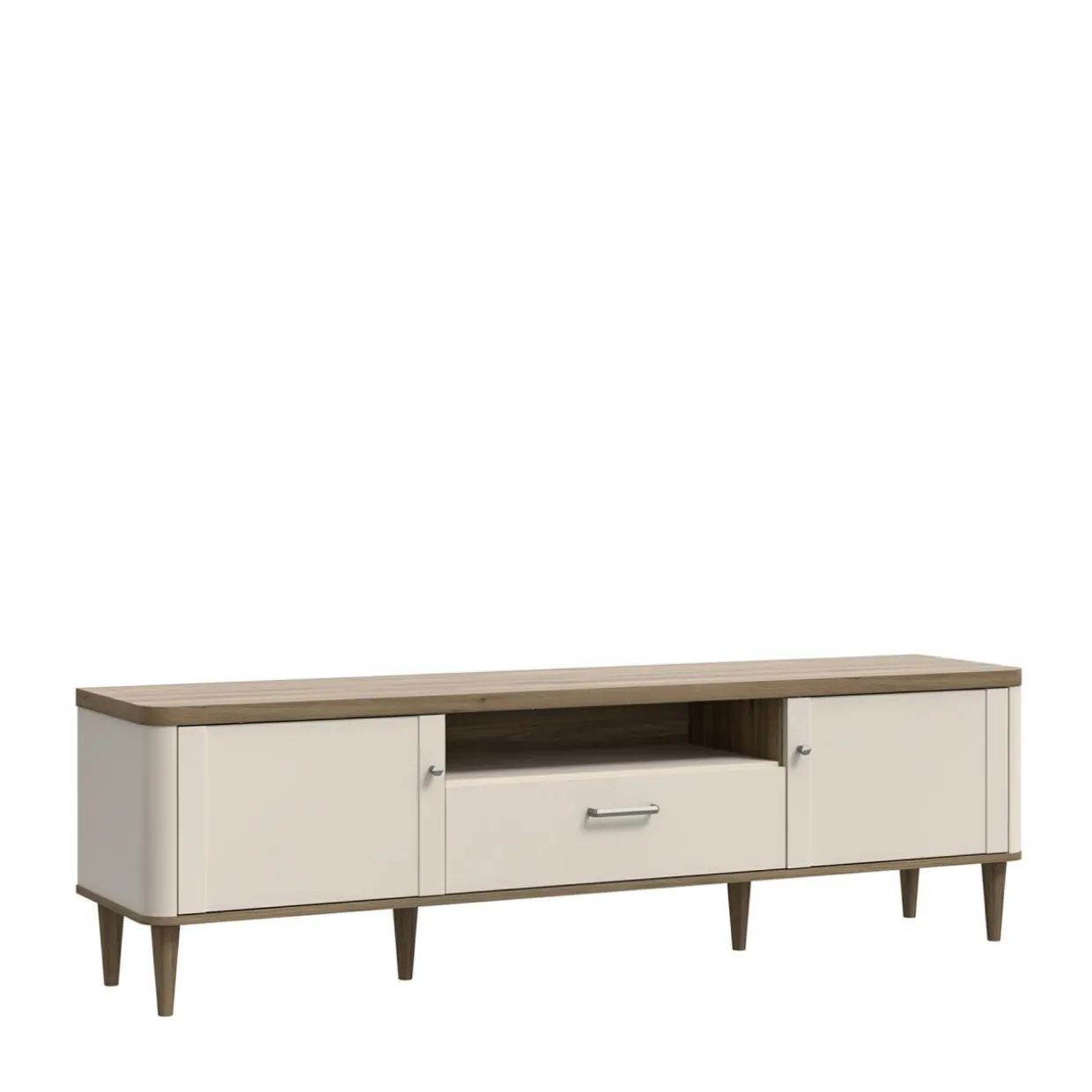 - Ciepły piaskowy beż z elementami dębu valencia tworzą nowoczesną kolekcję, sprzyjającą odpoczynkowi.