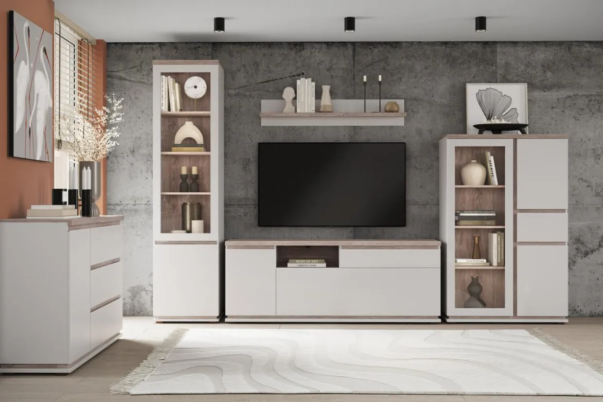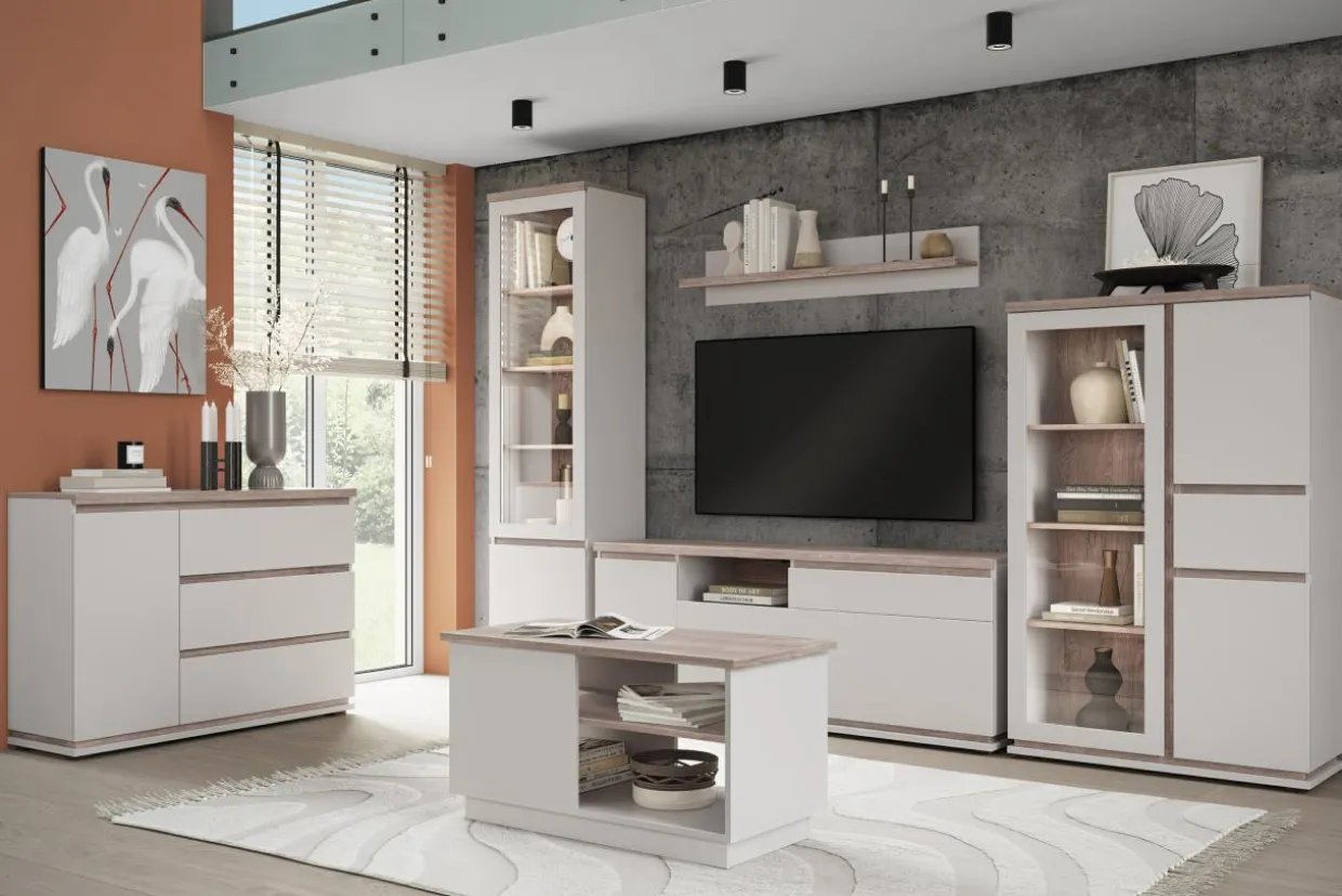 - Meble zostały wykończone w dwóch odcieniach: jasnoszarej perskiej perle i dębie madura. Wybarwienie będzie pasować do nowoczesnych salonów i jadalni.