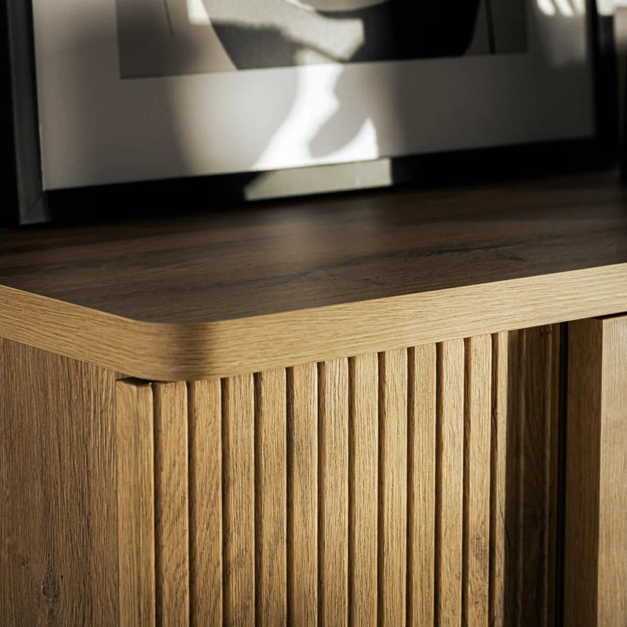 Kolekcję do salonu LUCIA wyróżnia wykończenie w imitacji jasnego dębu grandson o wyraźnym rysunku drewna, przez co zyskuje nieco retro charakter.
