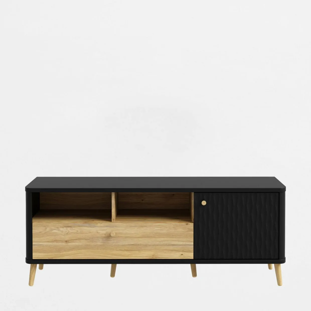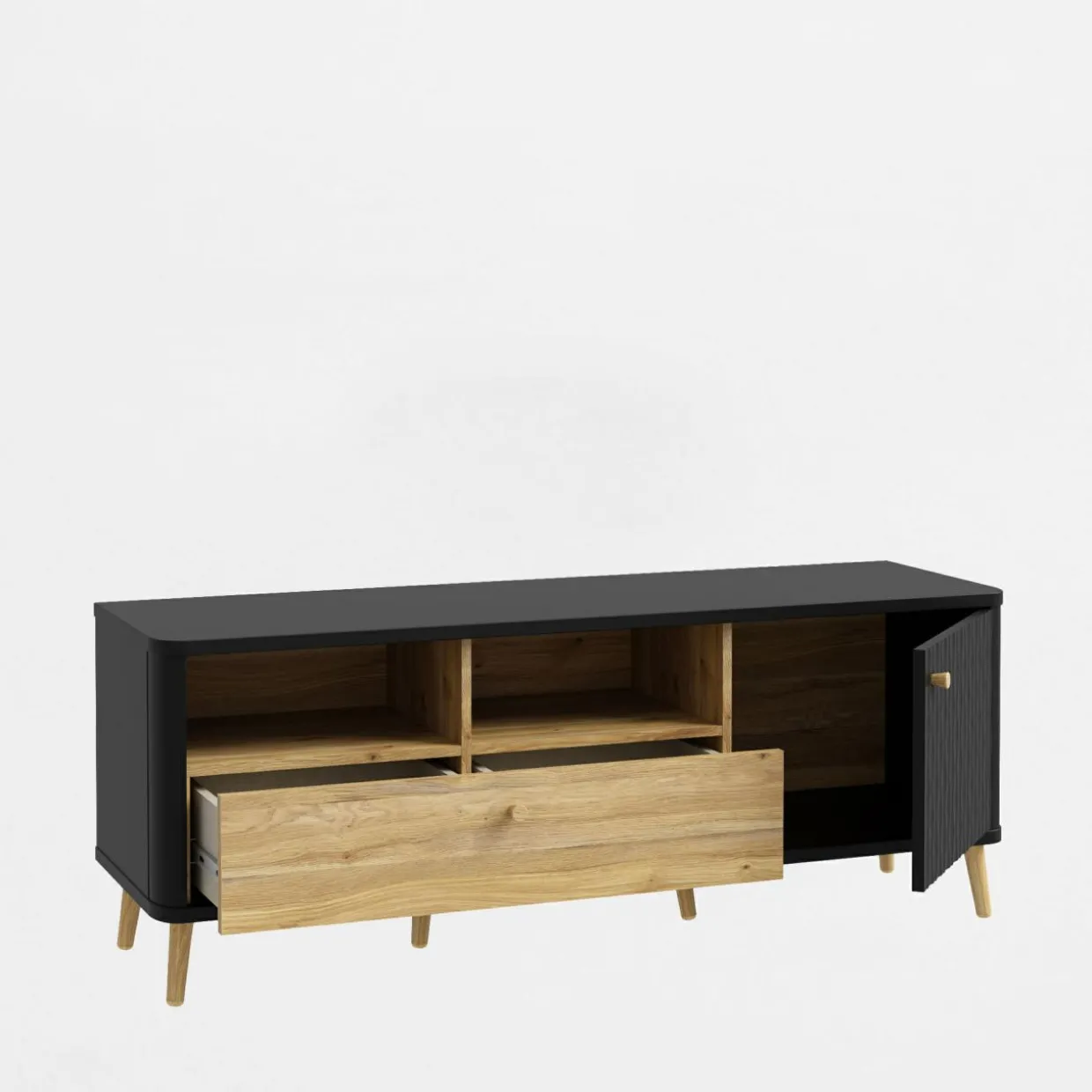 - Na półkach i w szafce ułożysz sprzęt elektroniczny. Blisko telewizora nic nie zakłóci sygnału internetowego.