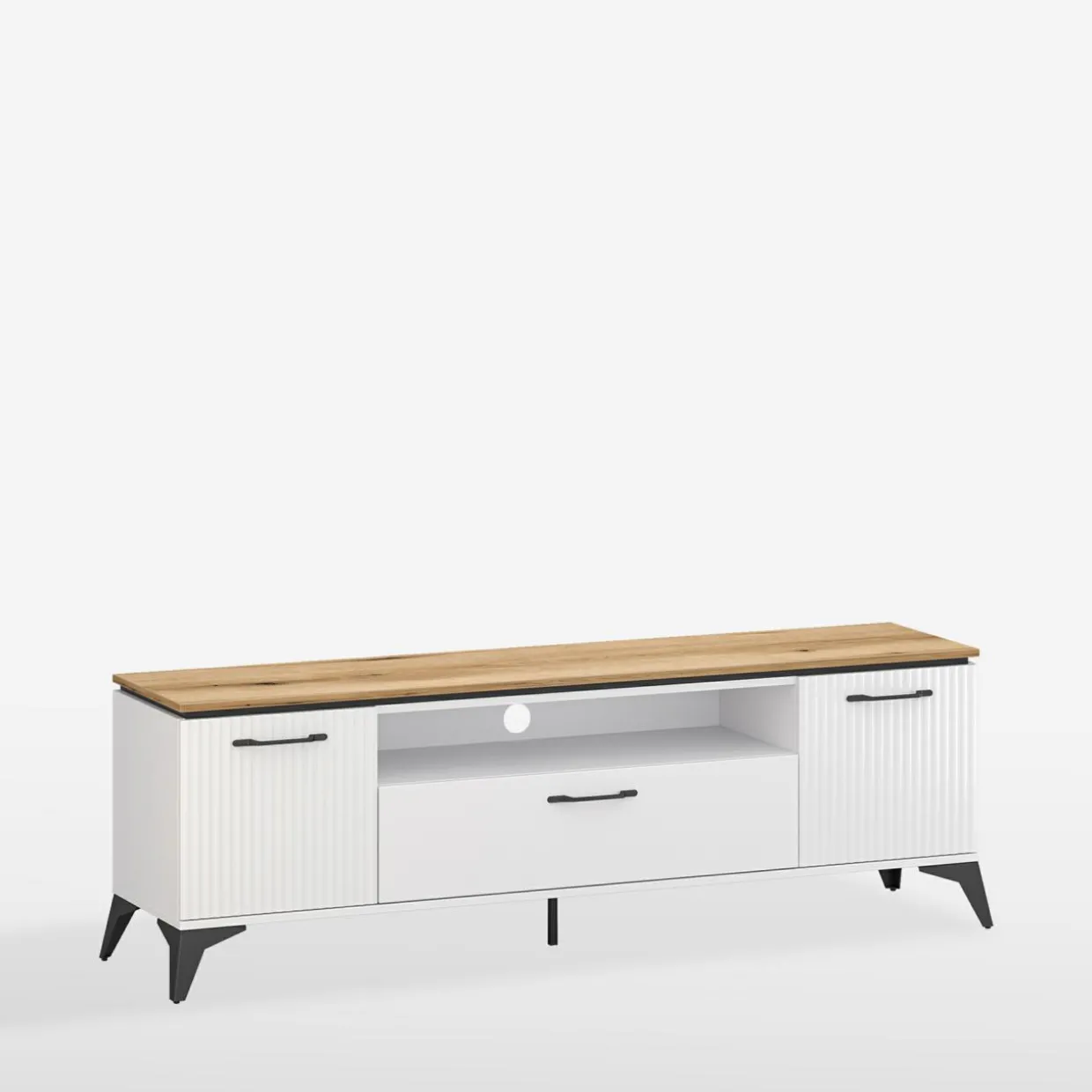 Z szafką RTV VELUTTO cały sprzęt niezbędny do telewizora znajdzie się w jednym miejscu. Poukładaj go na całej szerokości blatu, a akcesoria schowasz w zabudowanej części mebla.