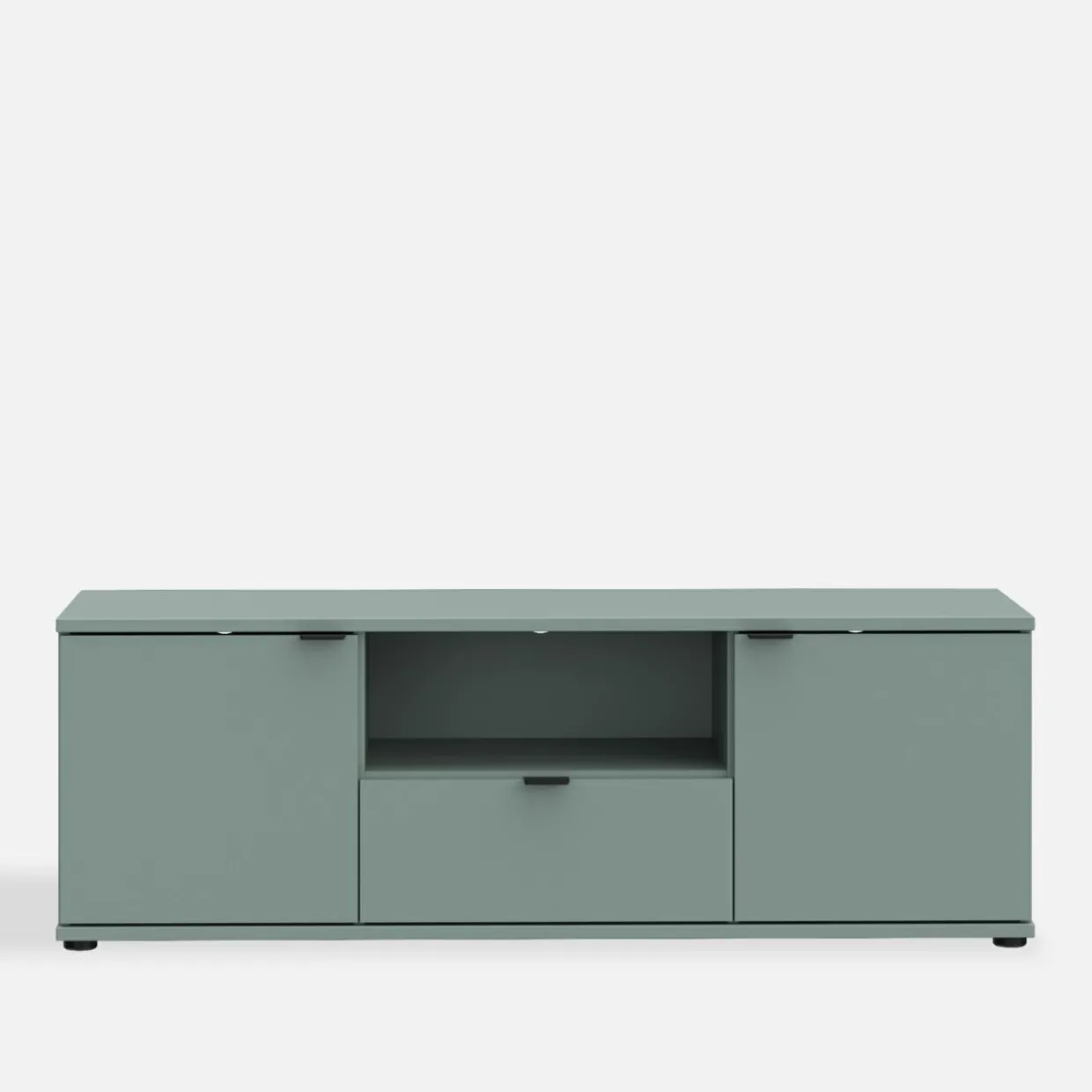 Szafka RTV GANYMEDE w odcieniu szałwi to miejsce na sprzęt multimedialny i akcesoria.