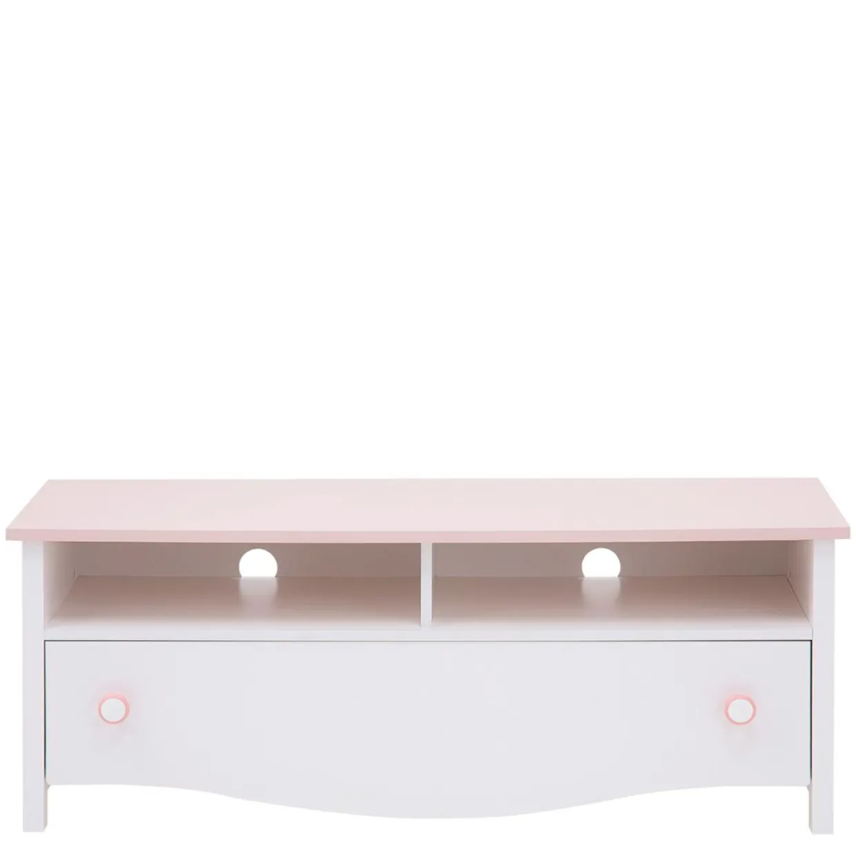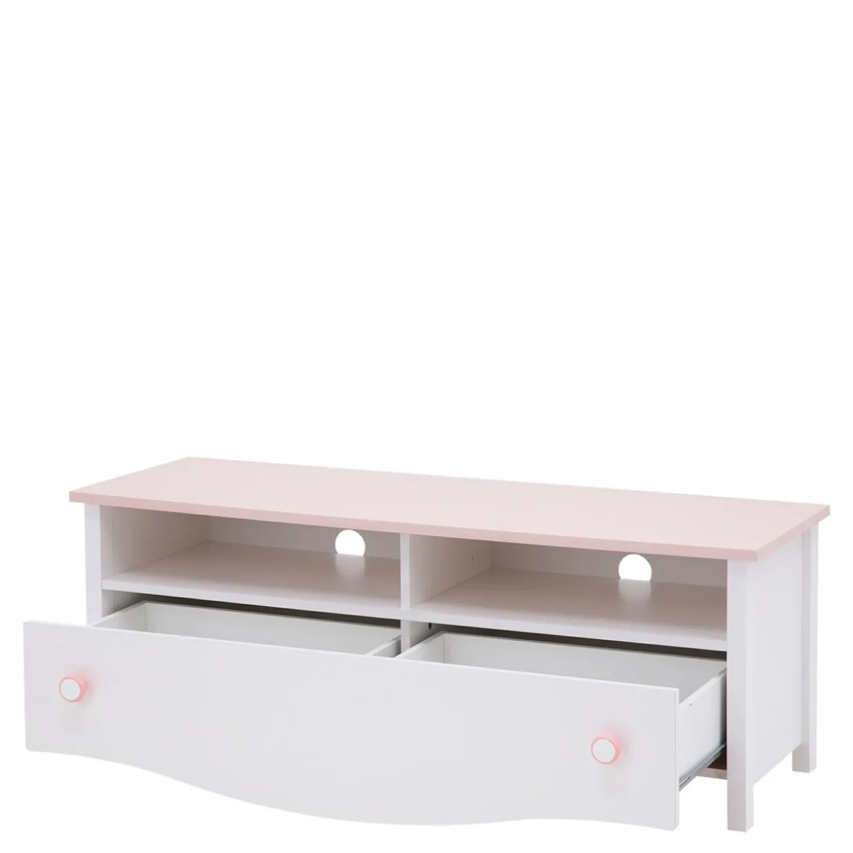 Zadbano o komfort przechowywania sprzętu RTV, projektując w tej niewielkiej szafce dwie oddzielne półki z praktycznymi otworami na kable.