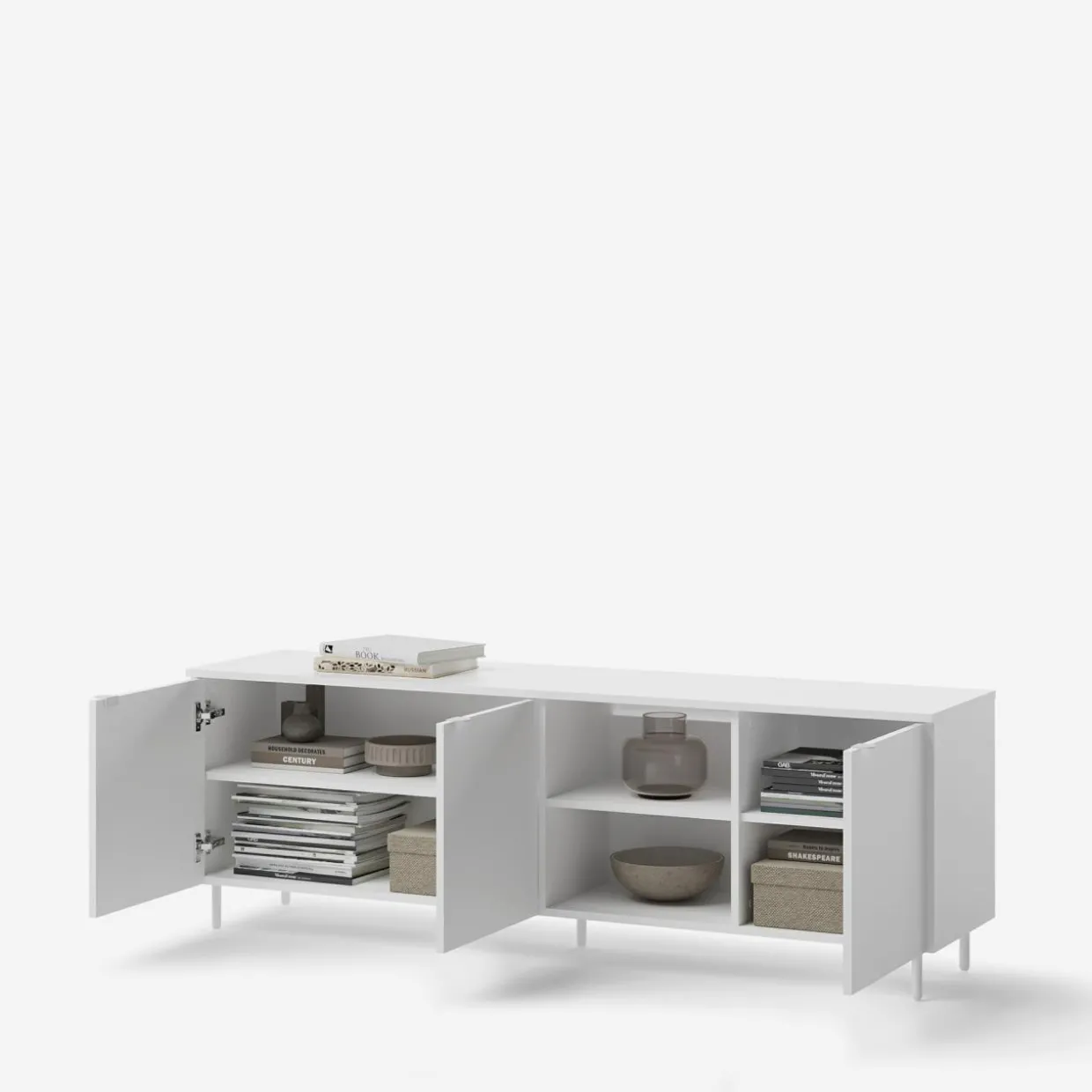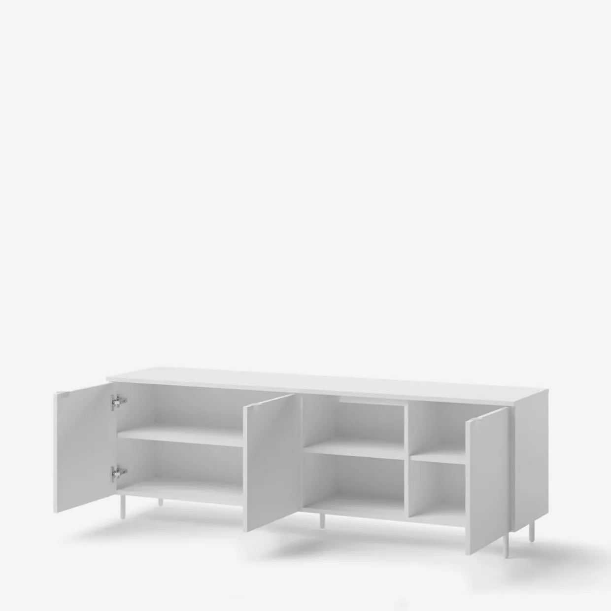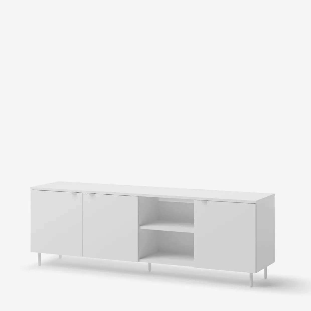 Nowoczesne meble do salonu i pokoju dziennego, wyróżniające się białym wykończeniem i metalowymi nóżkami. Minimalistyczny design i przemyślane detale sprawiają, że doskonale komponują się z jasnym drewnem, grafitem i pastelami, wprowadzając lekkość i estetykę do wnętrza.