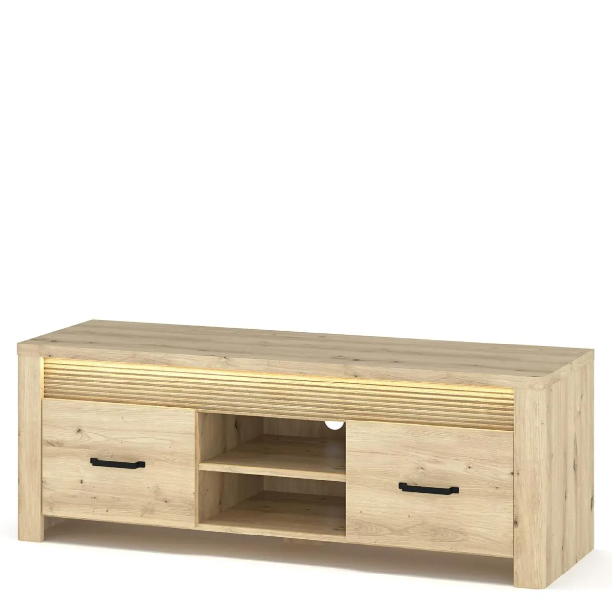 Szafka RTV MORIS posiada dwie szuflady oraz półki otwarte umieszczone w centralnej części mebla – w sam raz na kolekcje filmów, dokumenty, gazety lub przydatne przedmioty osobiste.