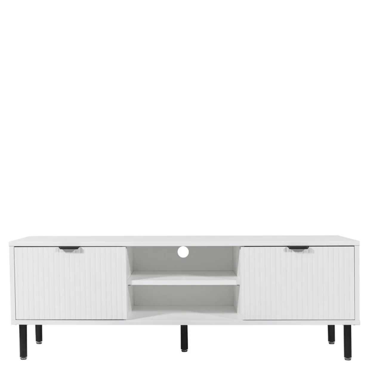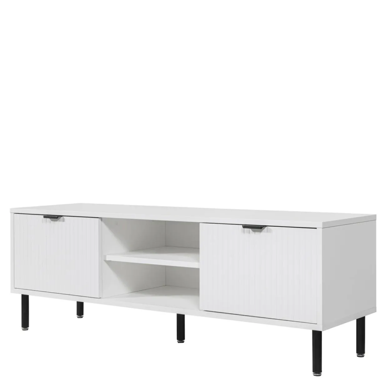 Biała szafka RTV z kolekcji WAVE wyróżnia się efektownym ryflowaniem i wysokimi, czarnymi nogami.