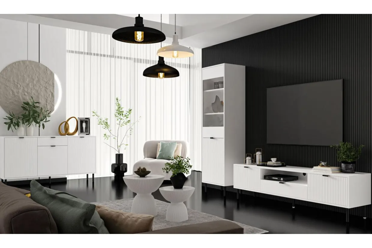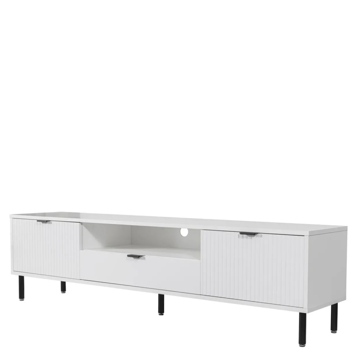 Szafka RTV WAVE w kolorze białym posiada efektowne ryflowanie oraz proste czarne metalowe uchwyty.