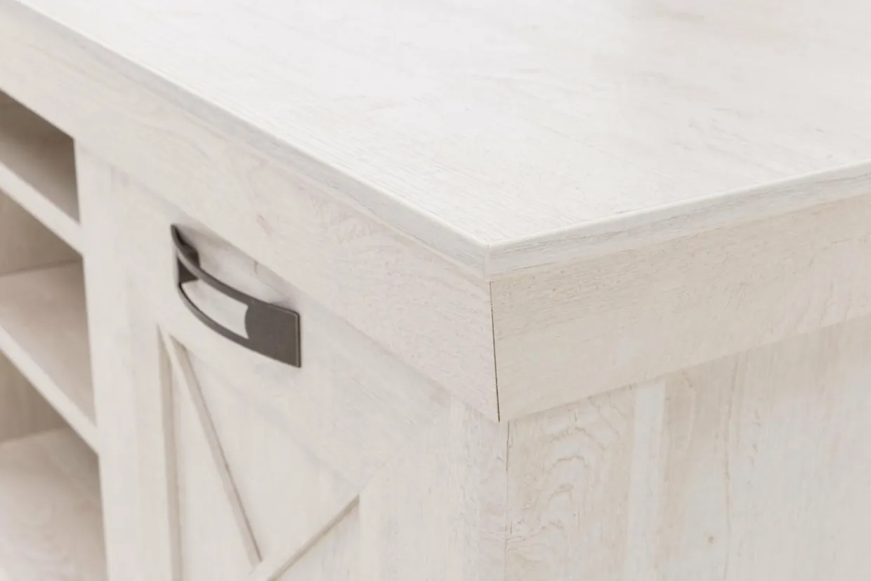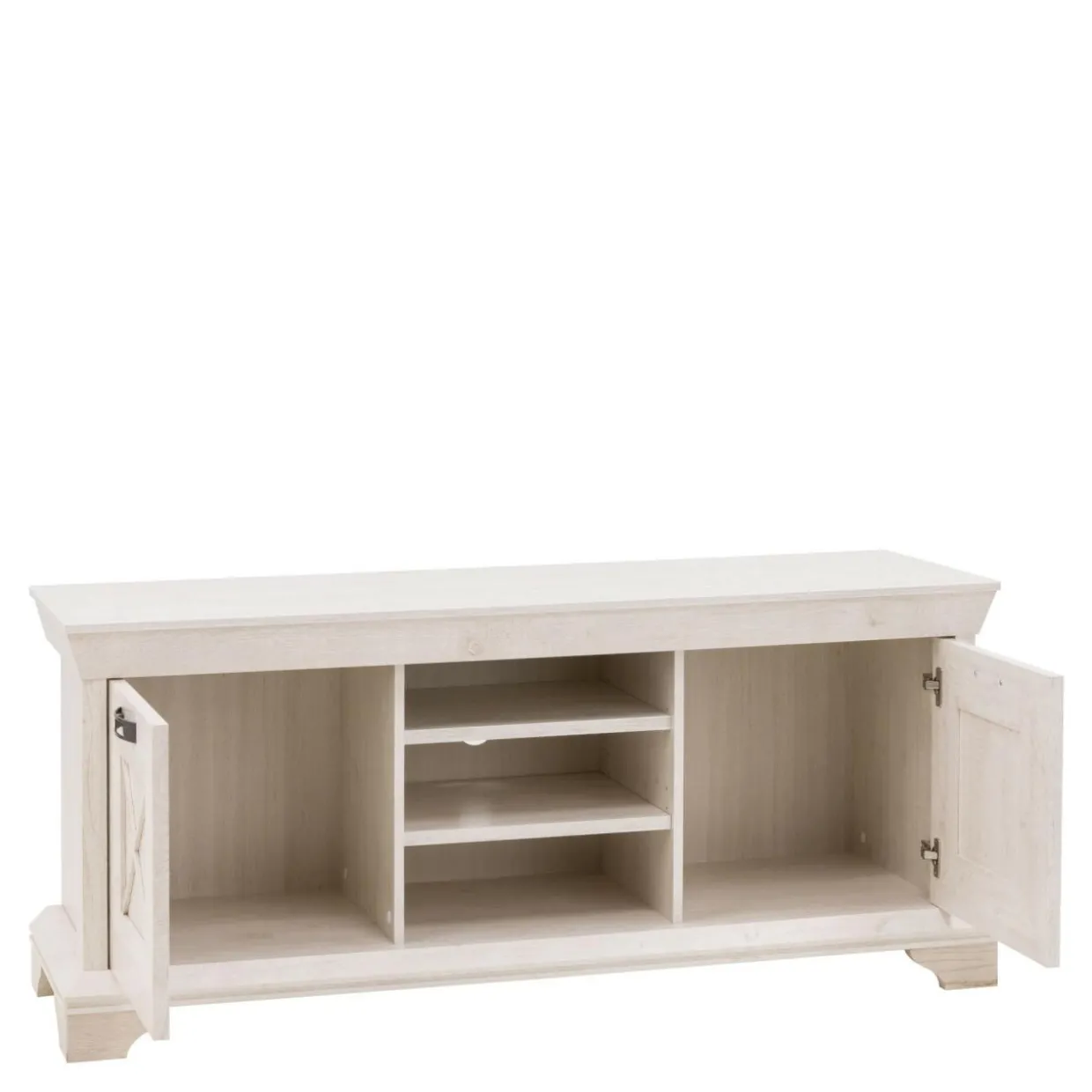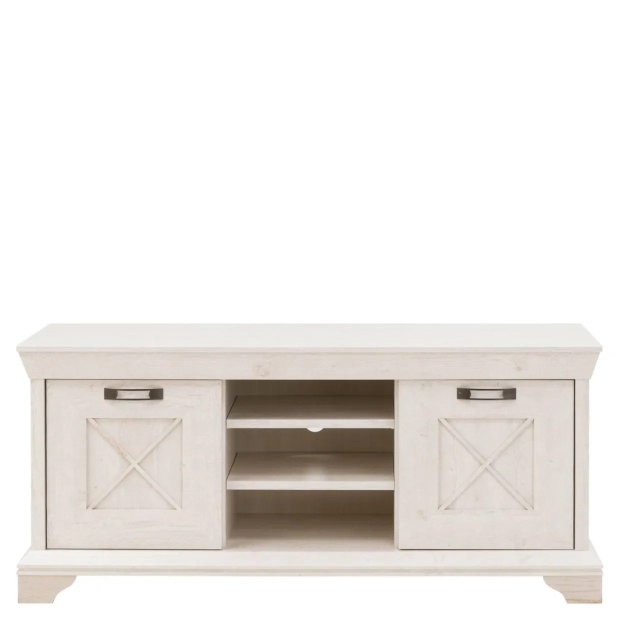 Dzięki szafce RTV KASHMIR konsekwentnie zrealizujesz swoją wizję salonu stylizowanego na wnętrza domostw z krainy lawendy. Bryła mebla umieszczona została na ozdobnym cokole, a metalowe uchwyty świetnie korespondują z jasnym wybarwieniem. Dodatkowym ozdobnym akcentem są skrzyżowane listewki na froncie szafki.