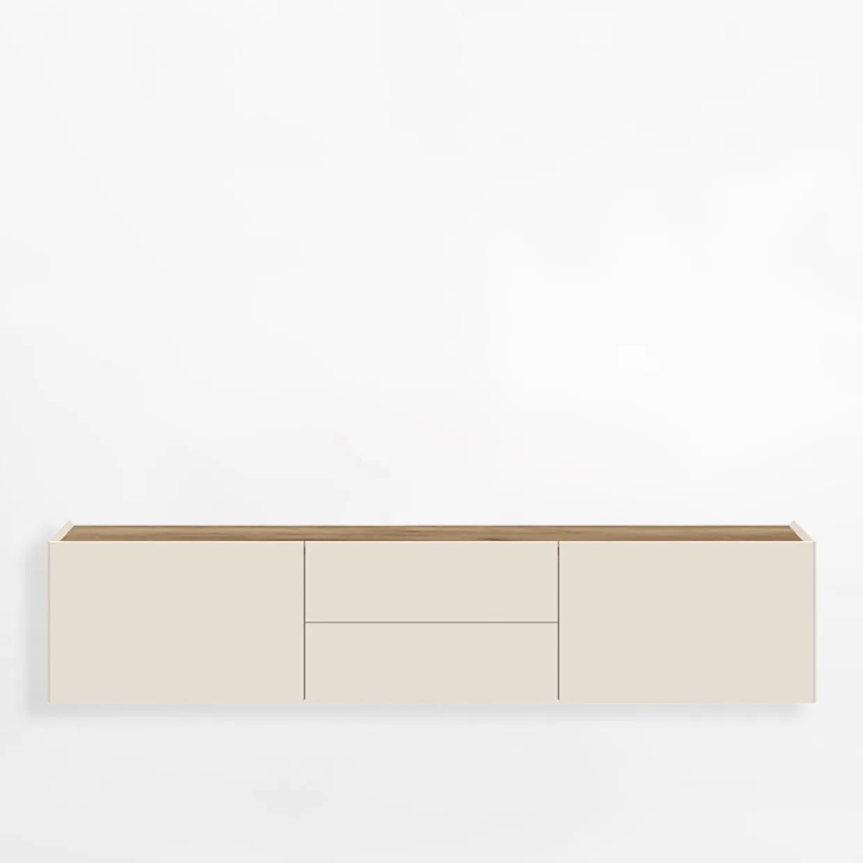 Kolekcja SKY45 to nowoczesne meble w kolorze kaszmiru z ciepłymi akcentami dębu tobacco. Prosta forma, starannie dopracowane detale i opcjonalne oświetlenie LED sprawiają, że idealnie pasują do współczesnych wnętrz. System cichego domyku, pojemne szuflady i wysokie nóżki zapewniają wygodę użytkowania i łatwość utrzymania porządku.