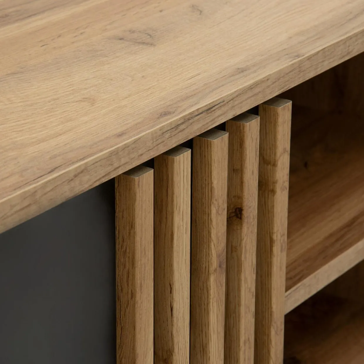 - Ciepły kolor dębu wotan, czarne, minimalistyczne fronty bez uchwytów i ozdobne lamele – całość prezentuje się elegancko i sprawi, że Twój salon nabierze nowego charakteru.