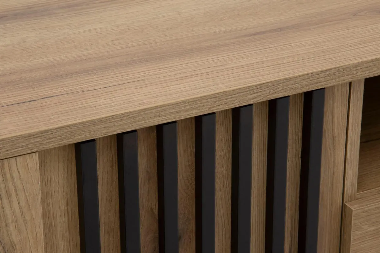 Połączenie laminatu imitującego drewno z czarnymi nóżkami i lamelami na froncie sprawia, że mebel odnajdzie się we wnętrzach urządzonych w stylu nowoczesnym i japandi.