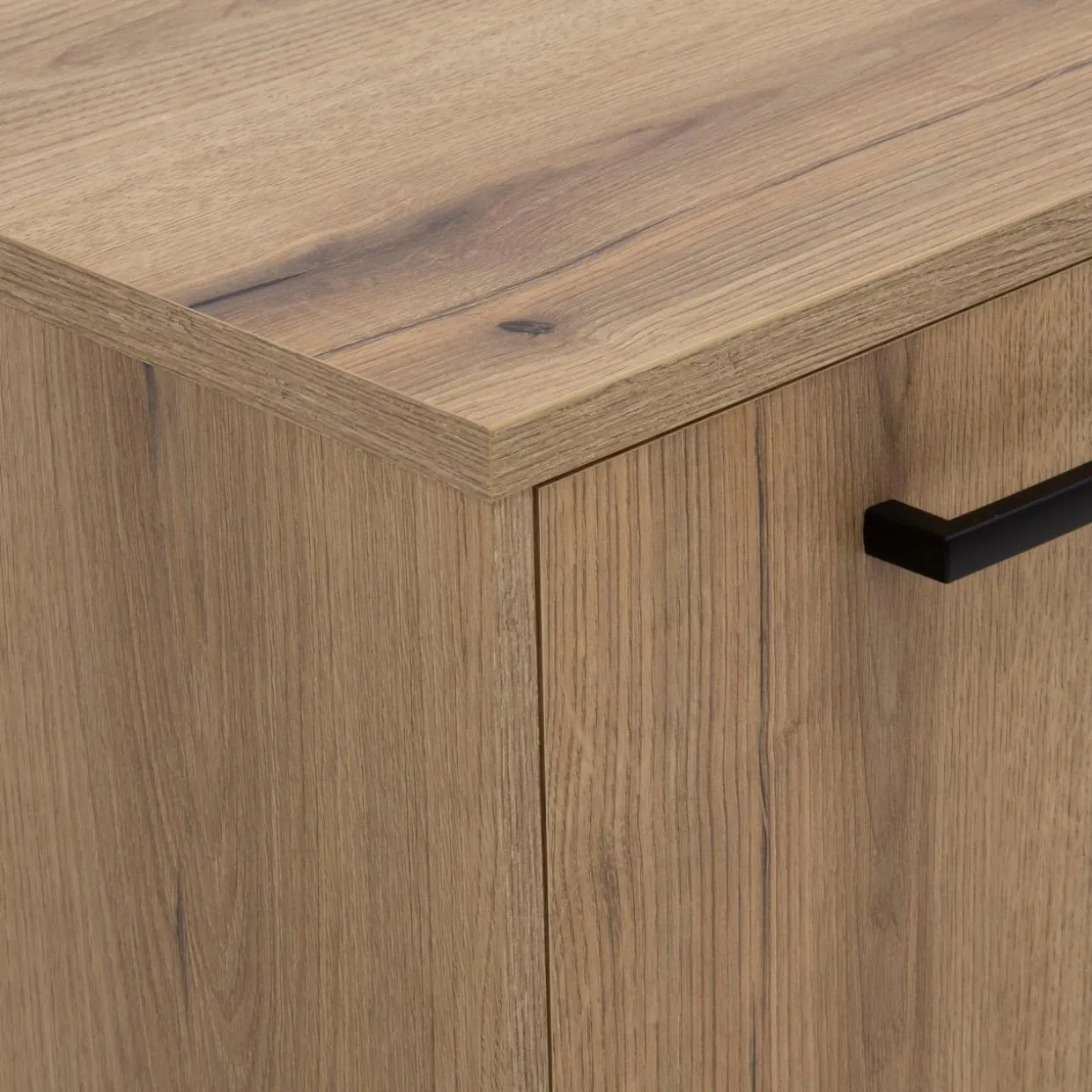 - Szafkę wykonano z płyty wiórowej o grubości 16 mm i pokryto laminatem w kolorze dąb evoke.