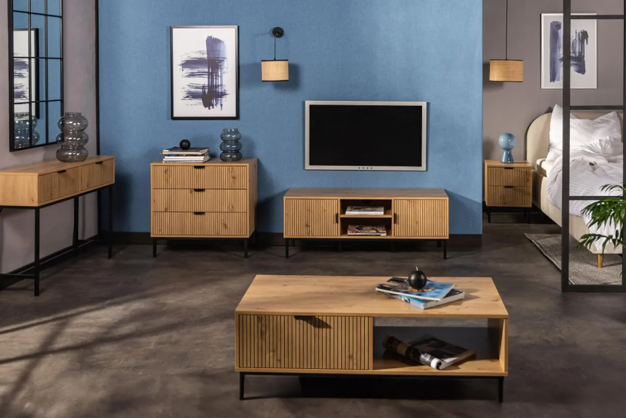 Przełam monotonię i ożyw wnętrze za pomocą ozdobnych żłobień na frontach – ryflowanie to jeden z najważniejszych trendów w projektach meblowych. Nieskomplikowana bryła i barwa jasnego drewna czyni kolekcję uniwersalną, pasującą do wiele stylów wnętrz.