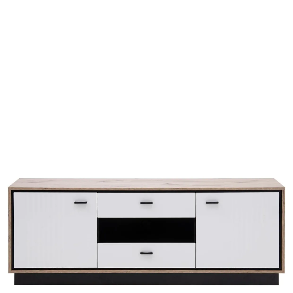 Klasyka zaprezentowana w modernistycznym wydaniu. Bryły skonstruowane są w przemyślany sposób: korpusy w jasnym kolorze dębu postawione są na czarnych podstawach, a całość zamykają białe fronty.