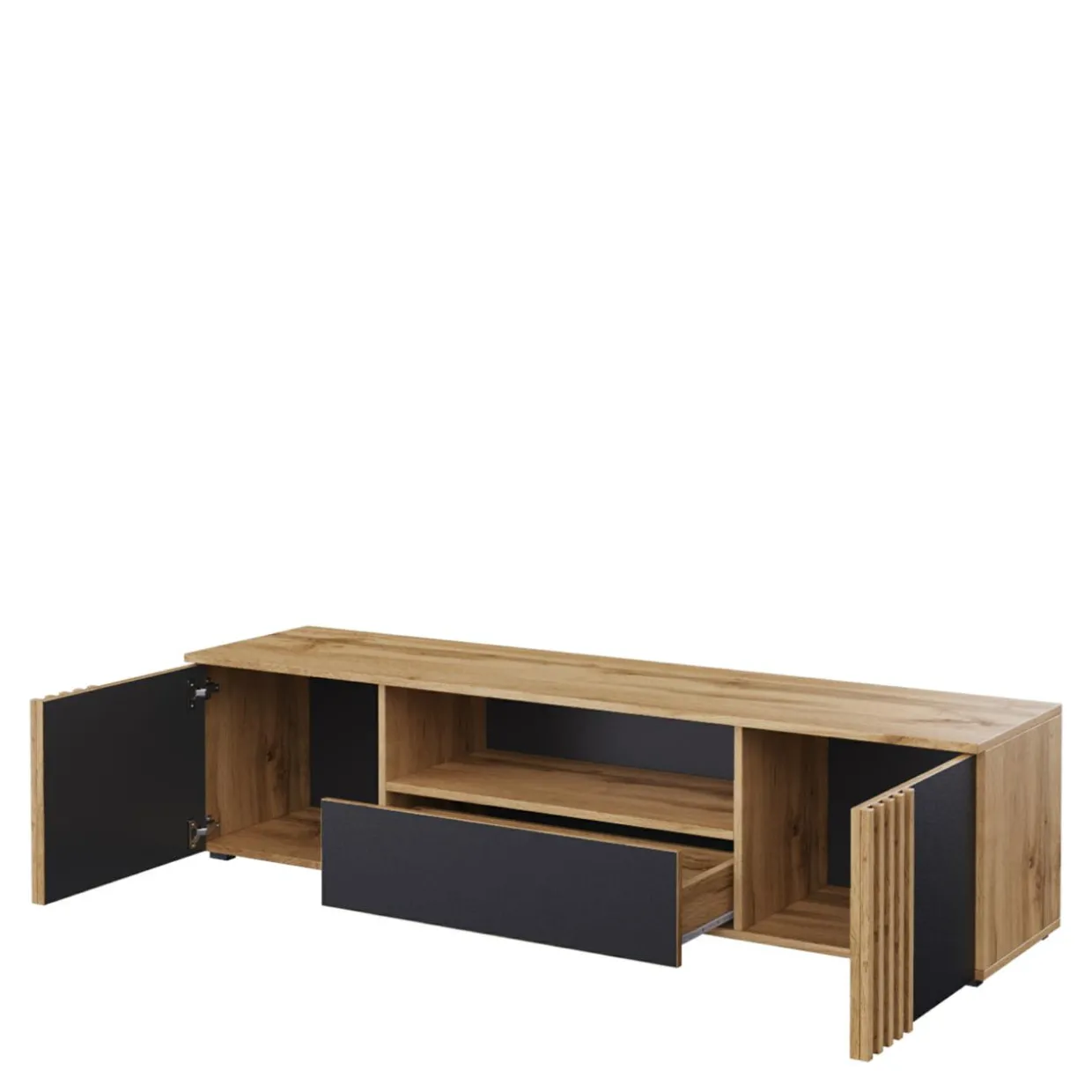 - Ciepły kolor dębu wotan, czarne, minimalistyczne fronty bez uchwytów i ozdobne lamele – całość prezentuje się elegancko i sprawi, że Twój salon nabierze nowego charakteru.