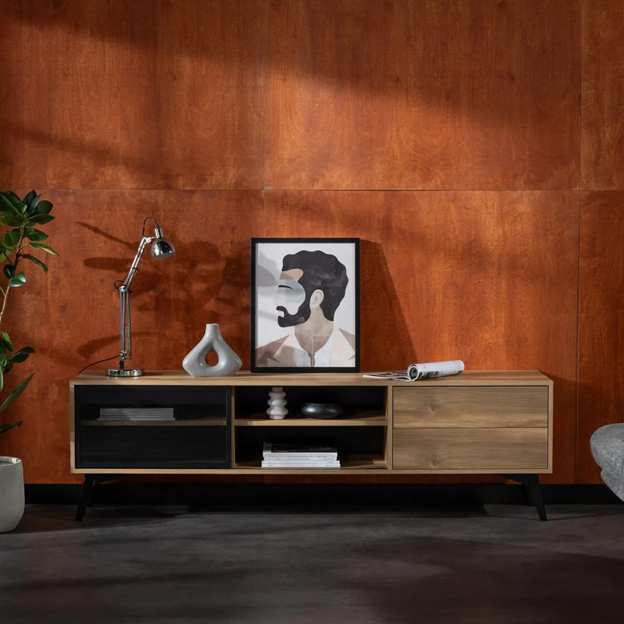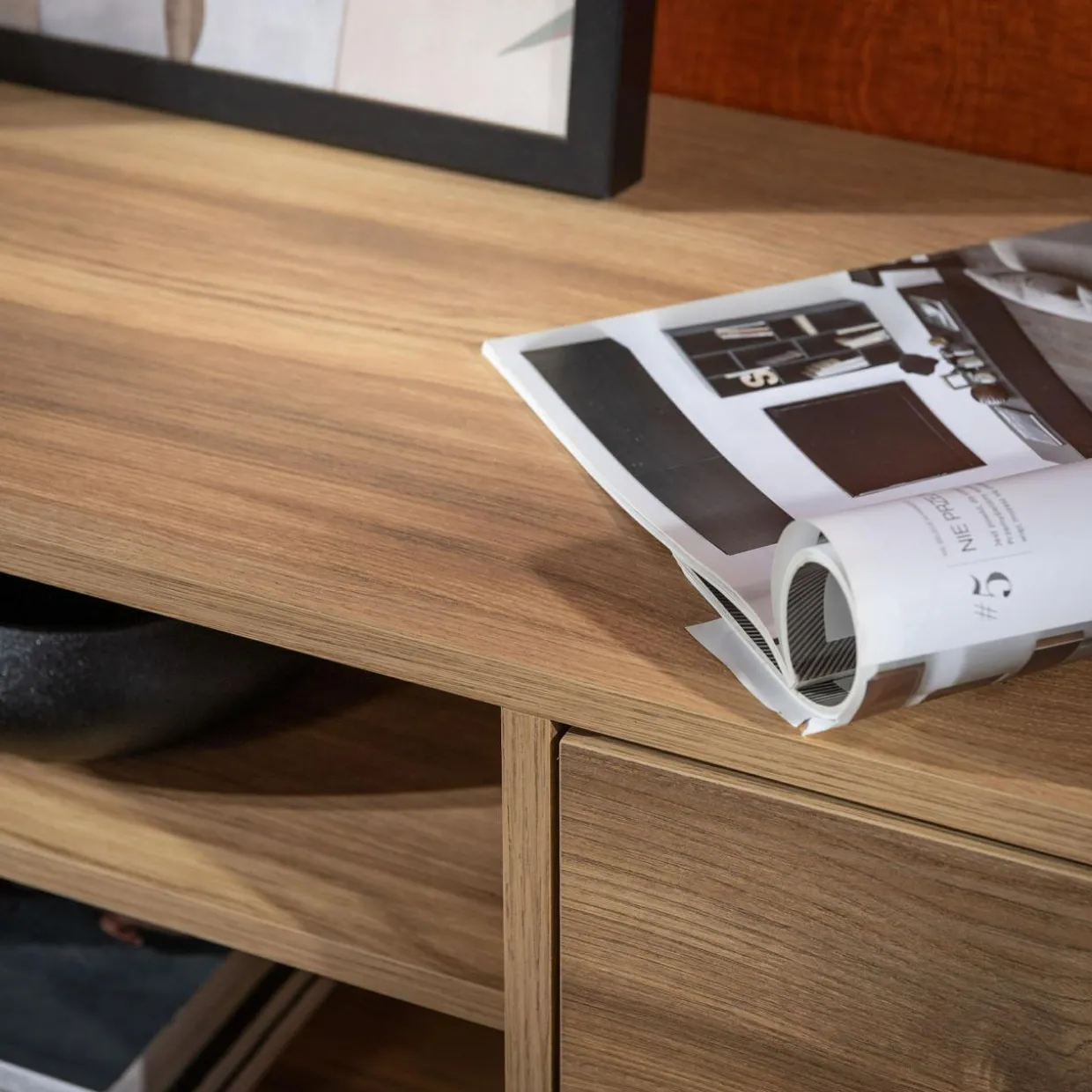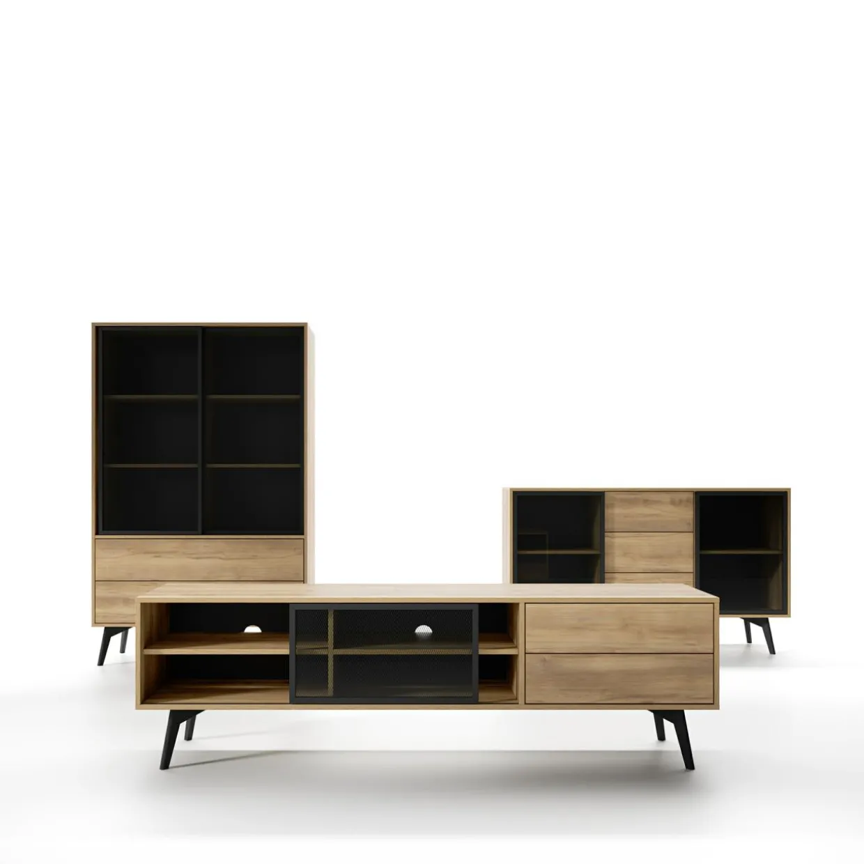 - Meble świetnie sprawdzą się w nowoczesnym i industrialnym pokoju dziennym.