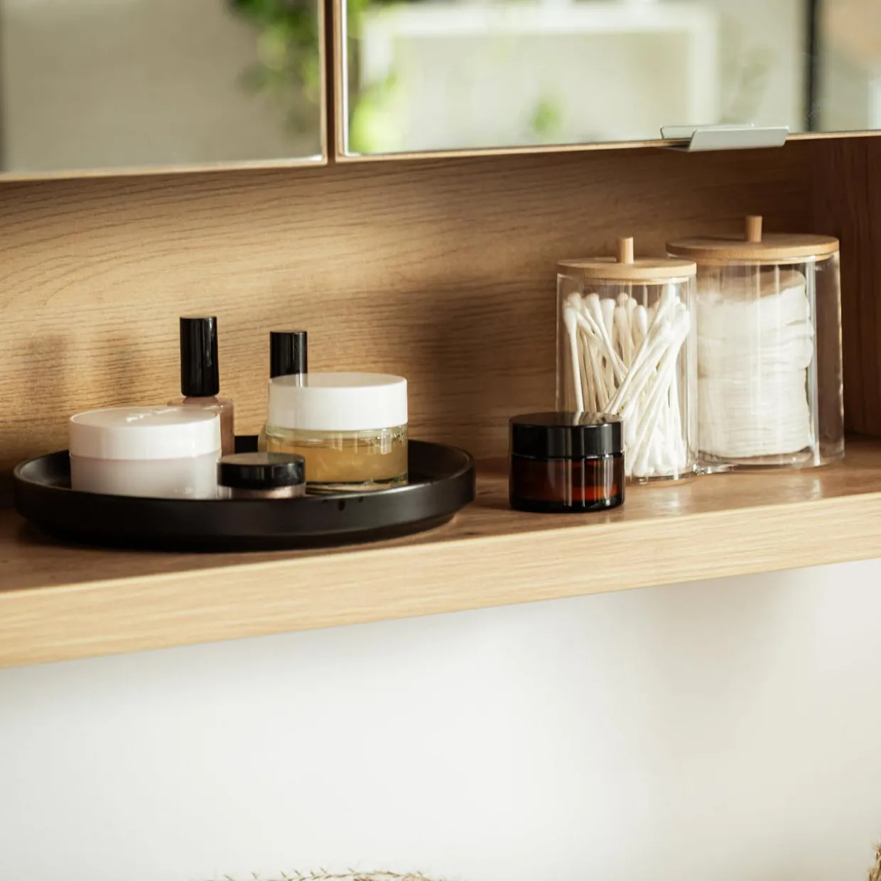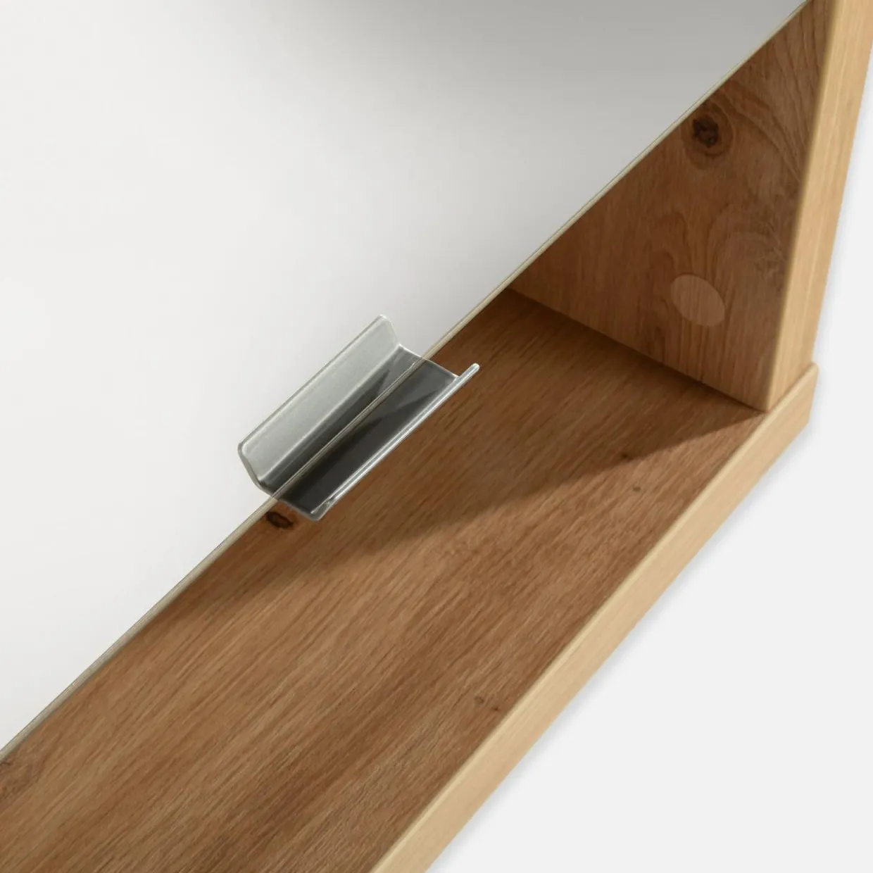 - Na półkach umieścisz mniejsze kosmetyki, a większe opakowania schowasz wewnątrz szafek. Półki oraz front mebla mają grubość 16 mm.