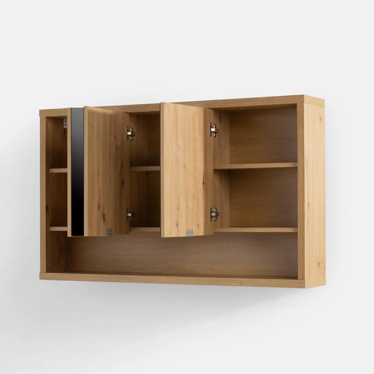 - Każda z 3 zamykanych szafek posiada przestrzeń podzieloną 2 półkami. Powierzchnia każdego lustra to: 475x386x19 mm.