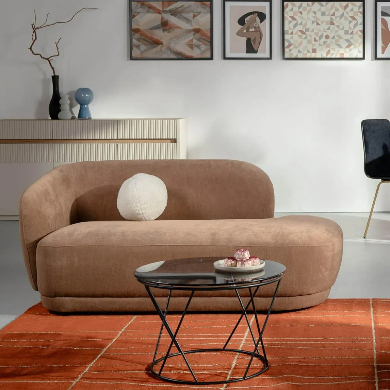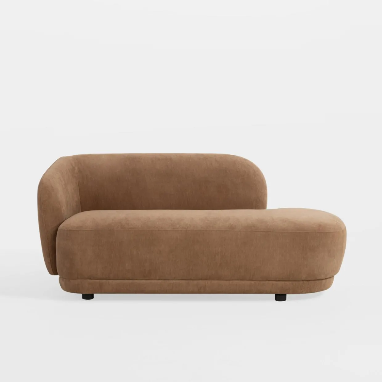 - Jasnobrązowa tkanina jest uniwersalna – szezlong świetnie się prezentuje w wielu aranżacjach.