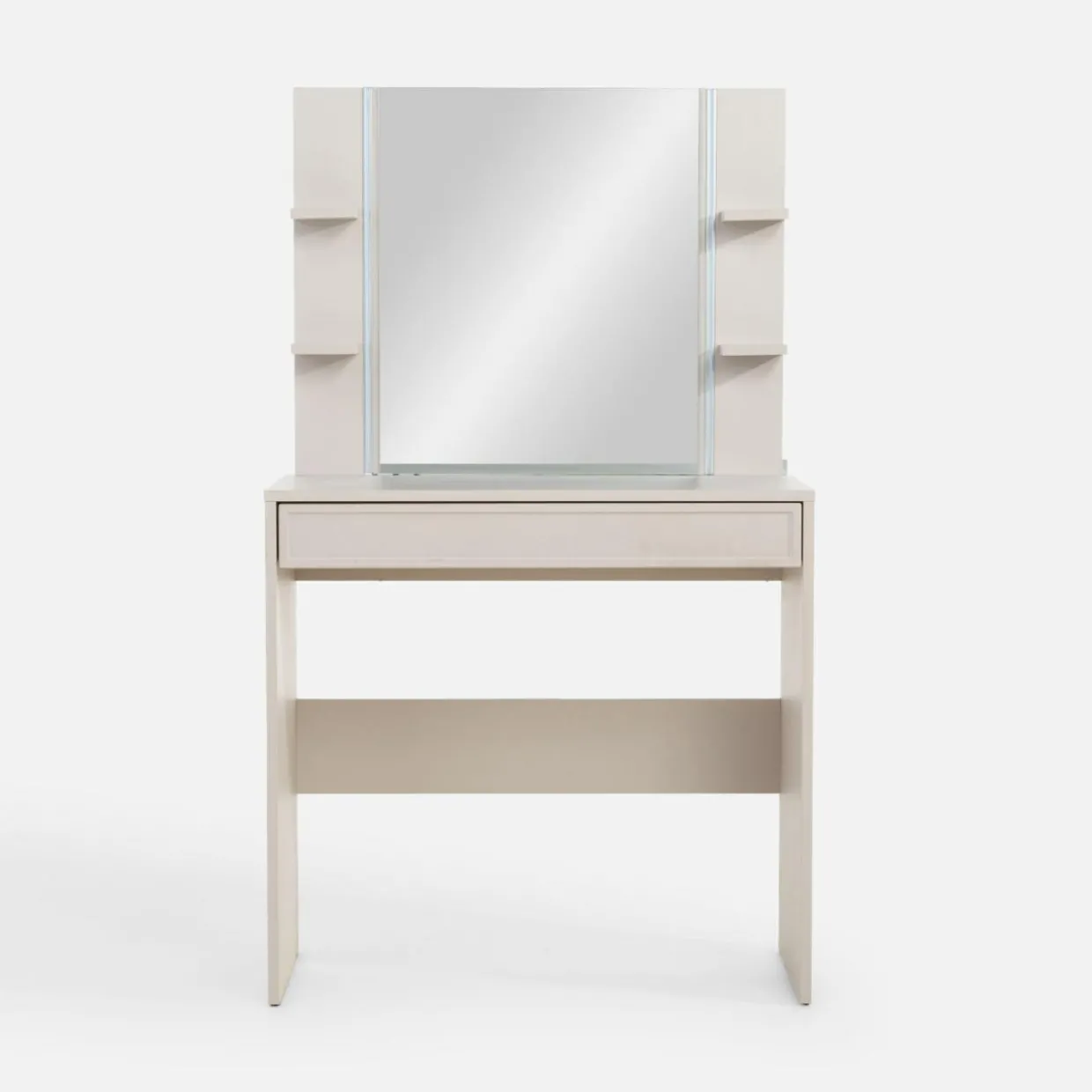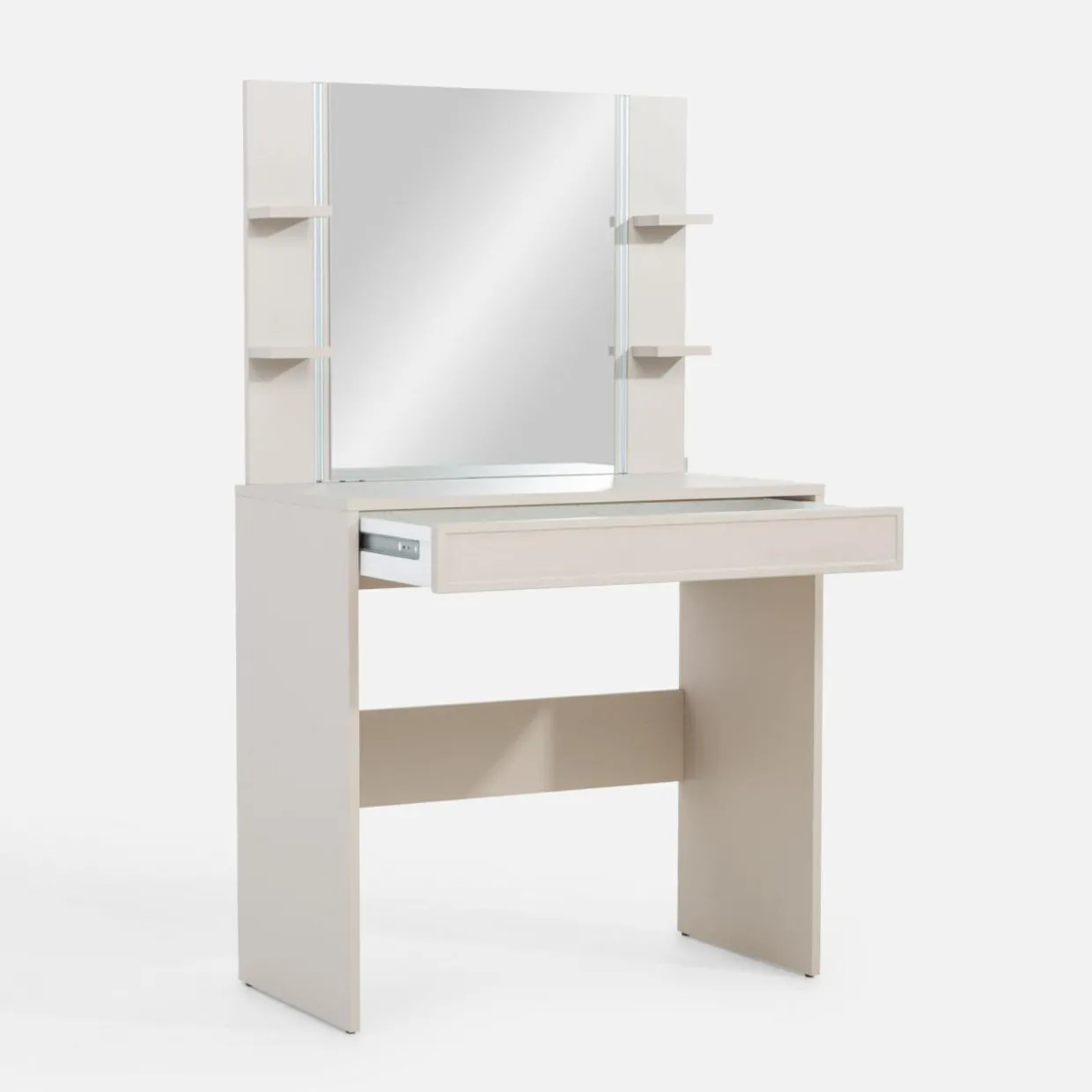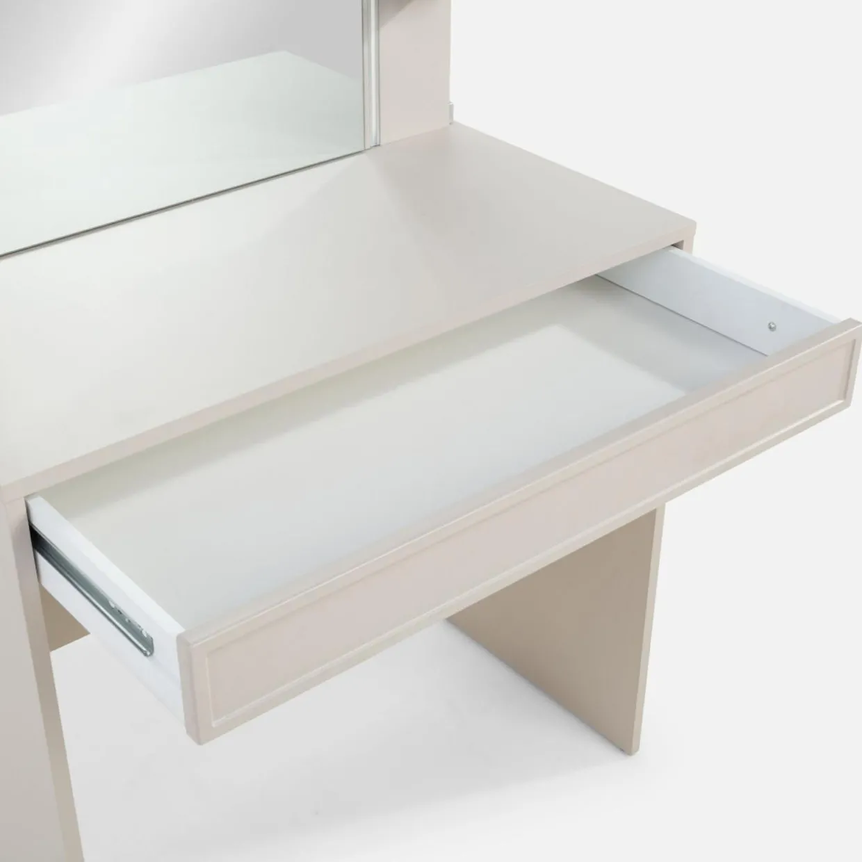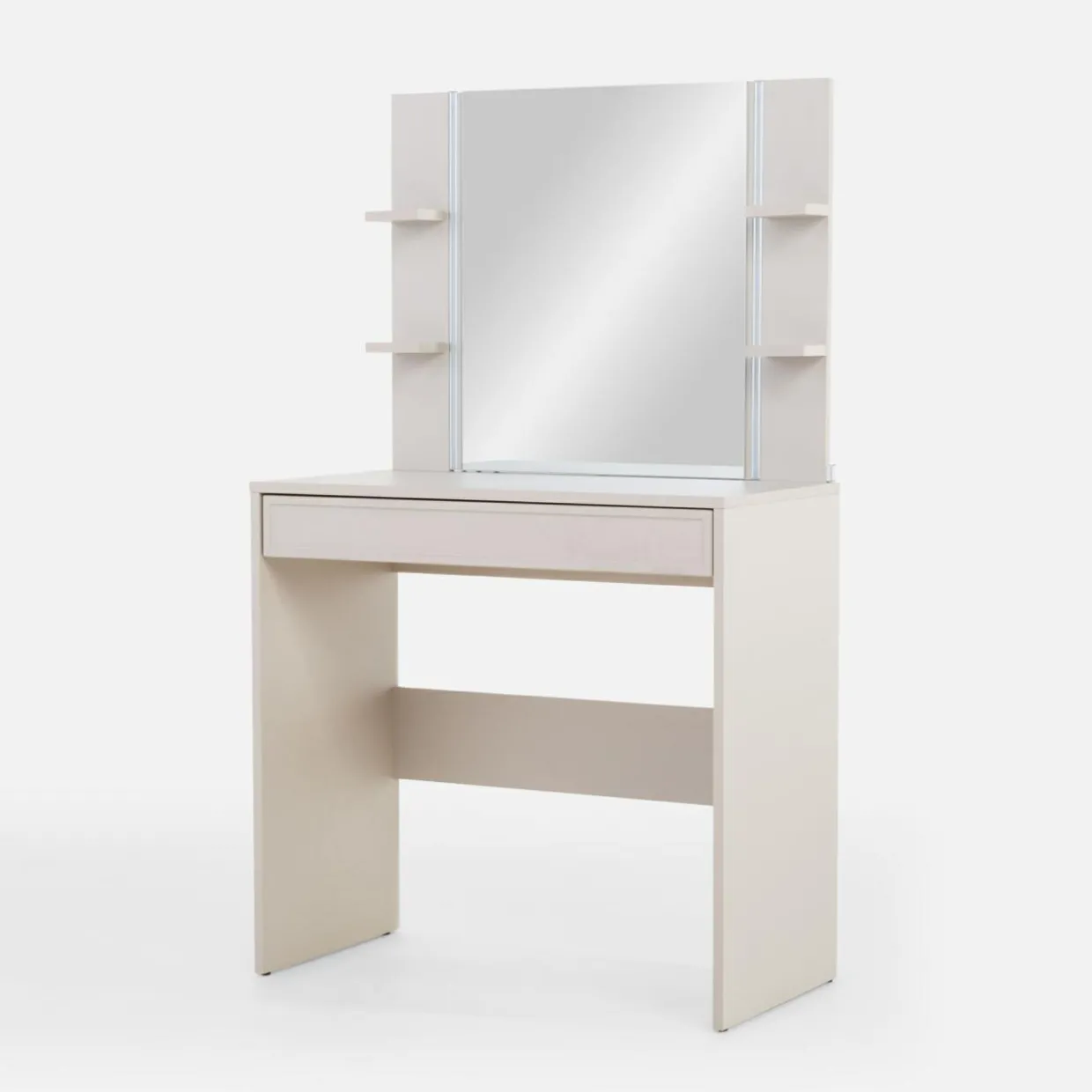 Toaletka, która wyróżnia się efektownym zwierciadłem, dodającym wnętrzu przestronności i stylu. Toaletka z lustrem kaszmirowa CARMEN, dzięki połączeniu funkcjonalności i estetyki, idealnie sprawdzi się w sypialniach urządzonych w nowoczesnym lub minimalistycznym stylu.