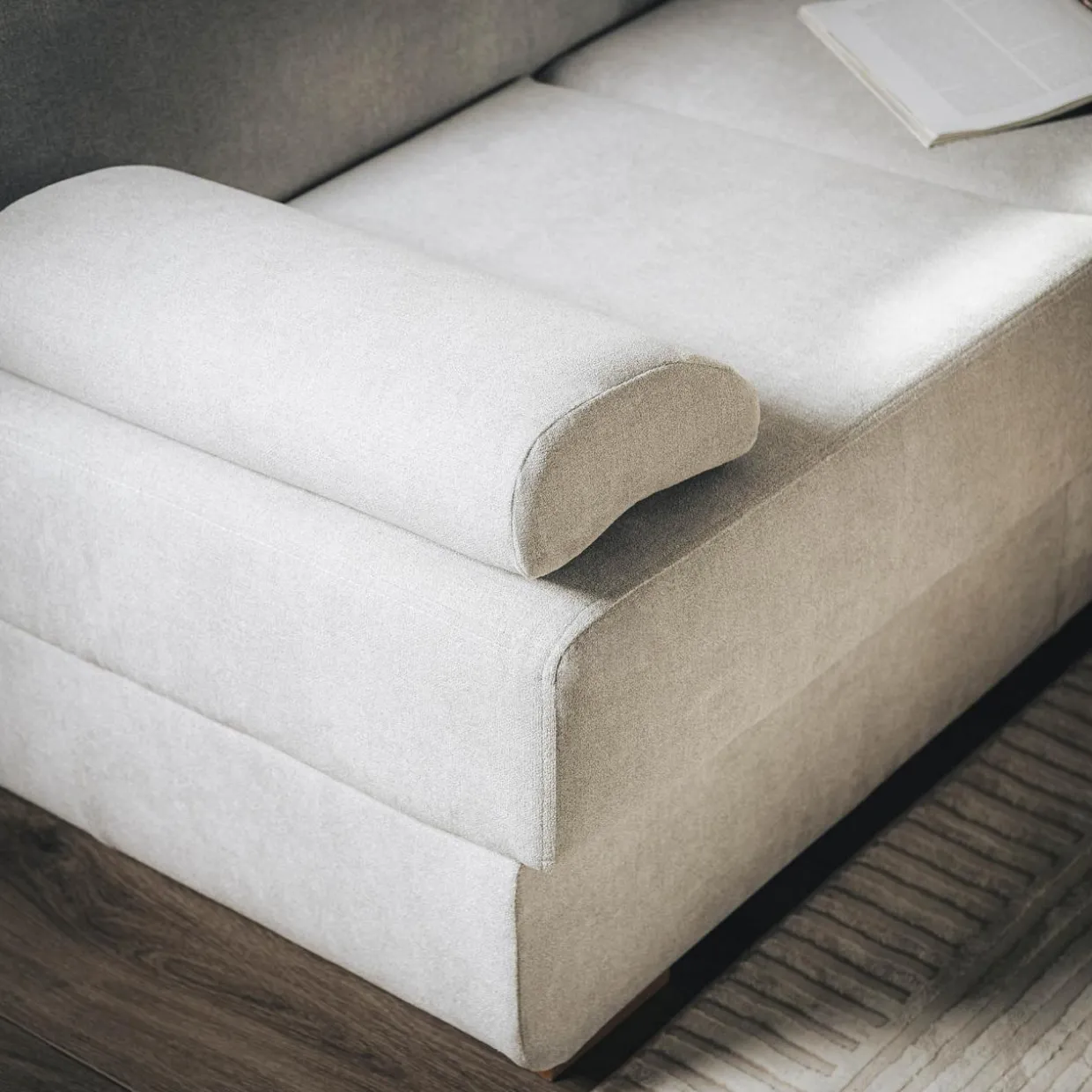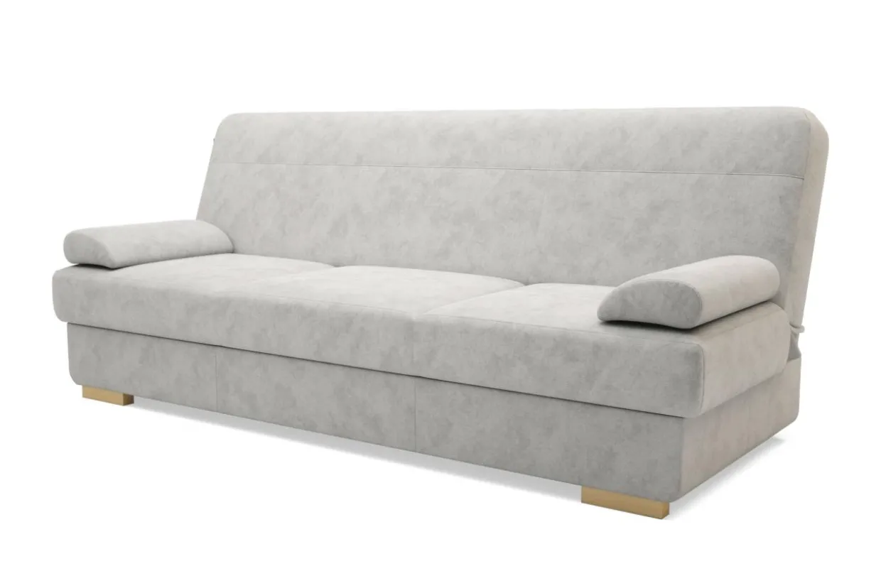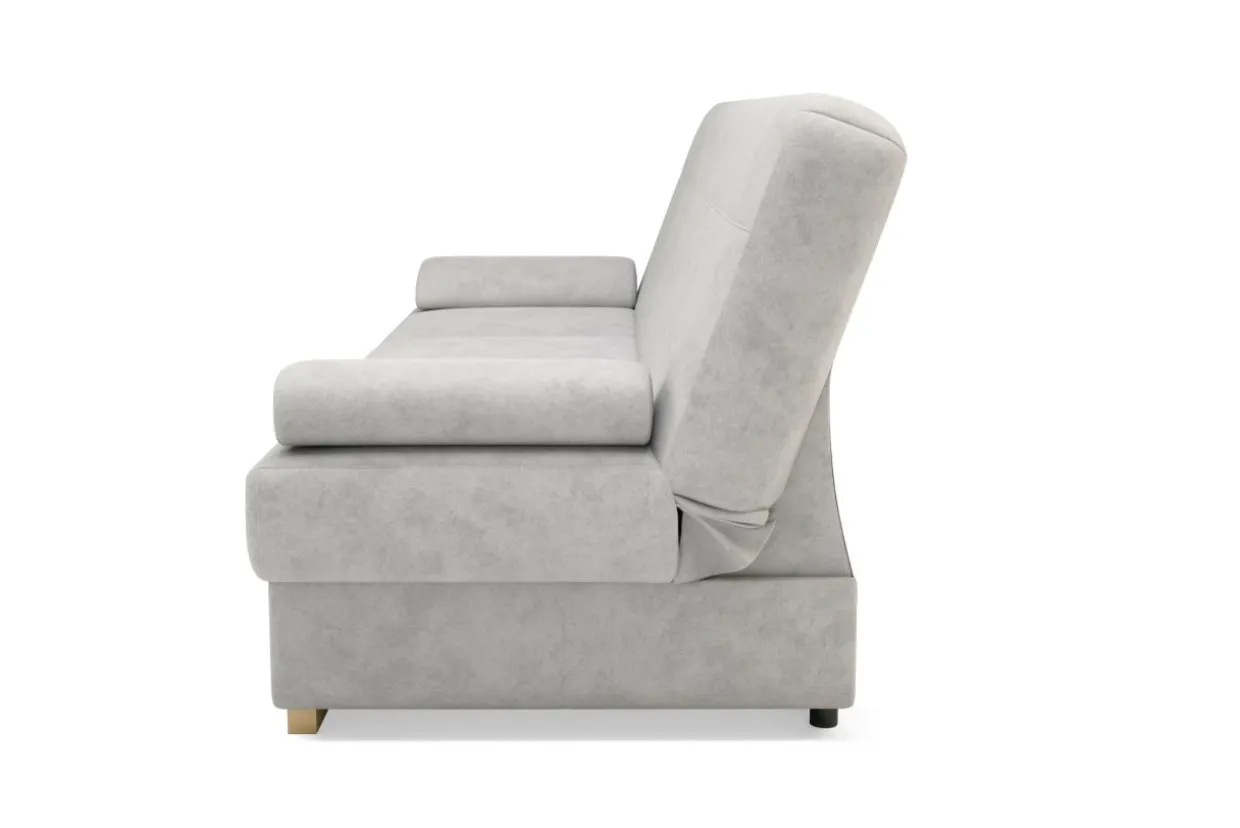 Przy szerokości jedynie 200 cm wersalka dysponuje praktyczną funkcją spania i pojemnikiem na pościel. Zamiast stałych podłokietników wykorzystano miękko wypełnione poduszki podłokietnikowe, których ściągnięcie zwiększa powierzchnię spania czy siedzenia. Poduszki te można podłożyć także pod głowę lub plecy.