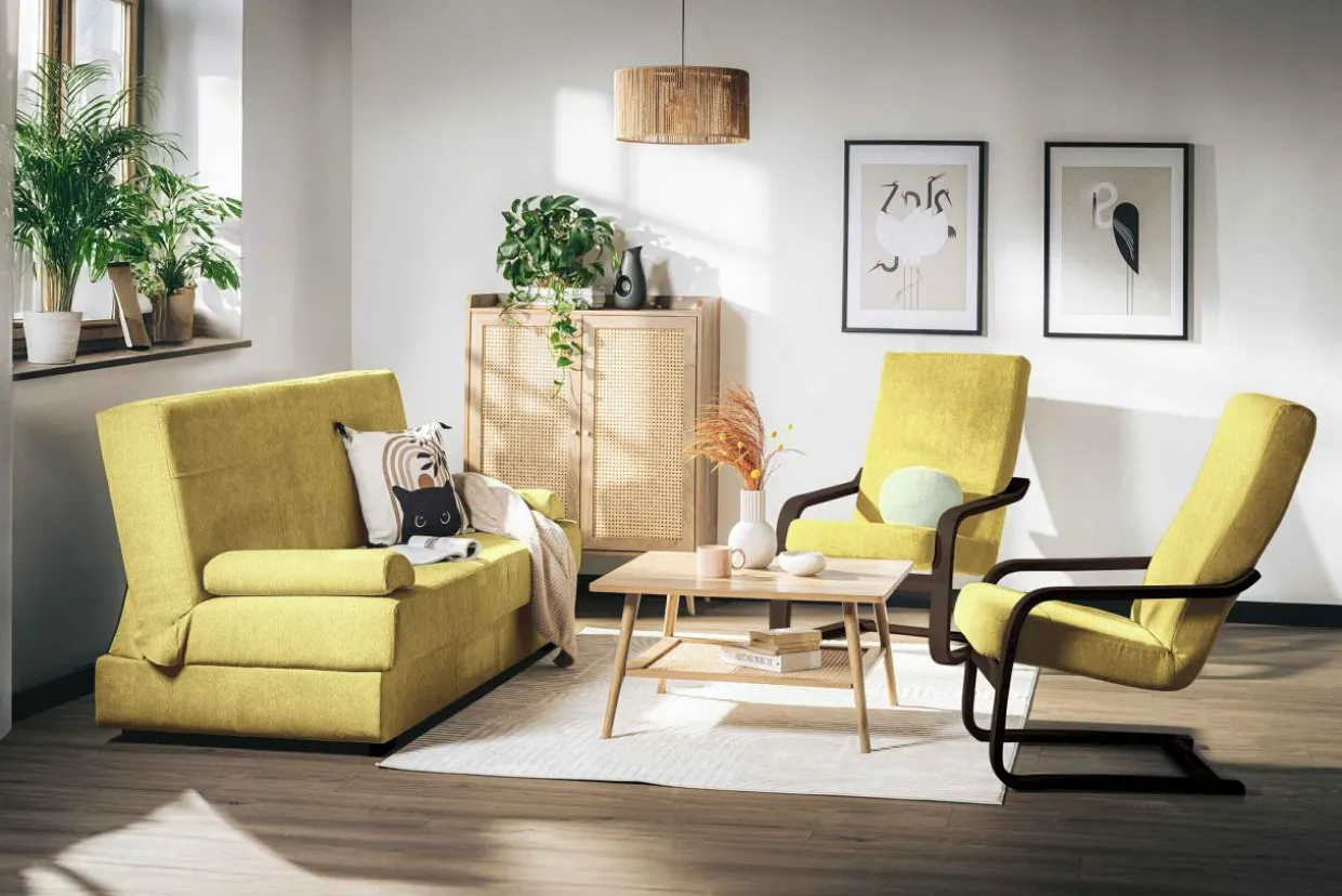 Zamiast stałych podłokietników wykorzystano miękko wypełnione poduszki podłokietnikowe, których ściągnięcie zwiększa powierzchnię spania czy siedzenia. Poduszki te są dobre także pod głowę lub plecy. Zarówno stelaż jak i nóżki wykonano z drewna dzięki czemu mebel jest bardziej naturalny.