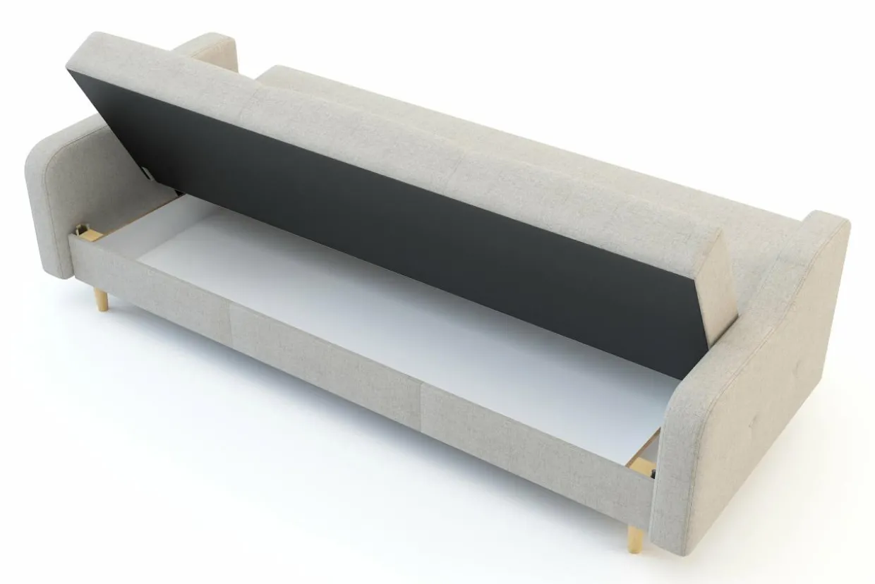 - wersalka posiada duży pojemnik na pościel, dodatkowe koce lub poduszki — to dodatkowa powierzchnia do przechowywania, nieoceniona szczególnie na małych metrażach.