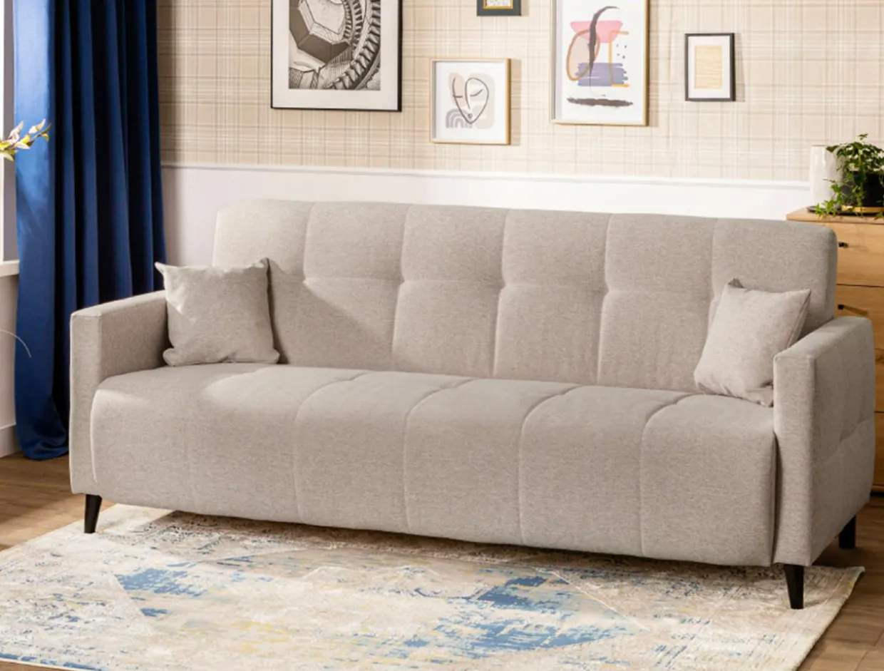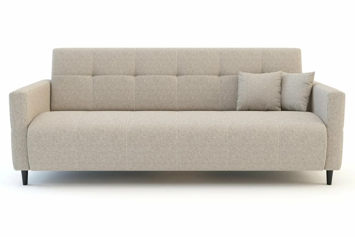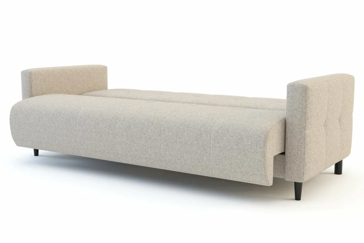 Połączenie pianki i sprężyn falistych w siedzisku i oparciu sprawia, że po rozłożeniu powierzchnia spania wersalki dobrze dopasowuje się do kształtu ciała. Ciekawym elementem jest ozdobne pikowanie, które ładnie przełamuje pozorna prostotę siedziska i oparcia. Tapicerowane podłokietniki subtelnie uzupełniają linie mebla i pozwalają przybrać wygodna pozycję.