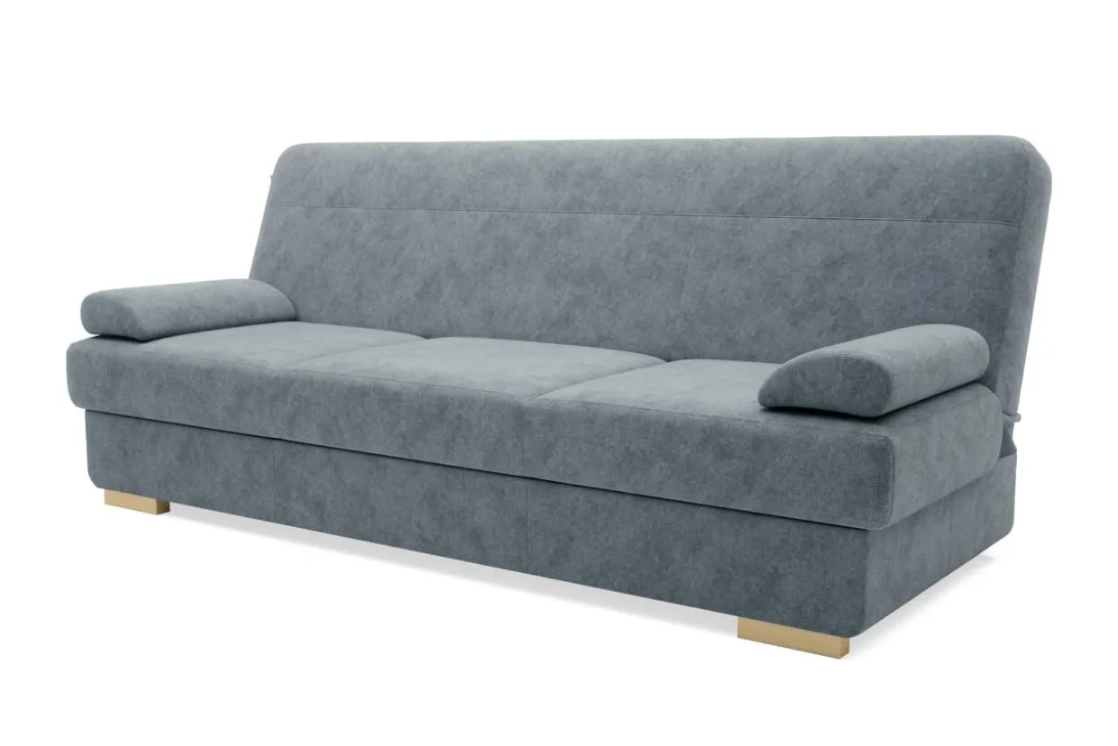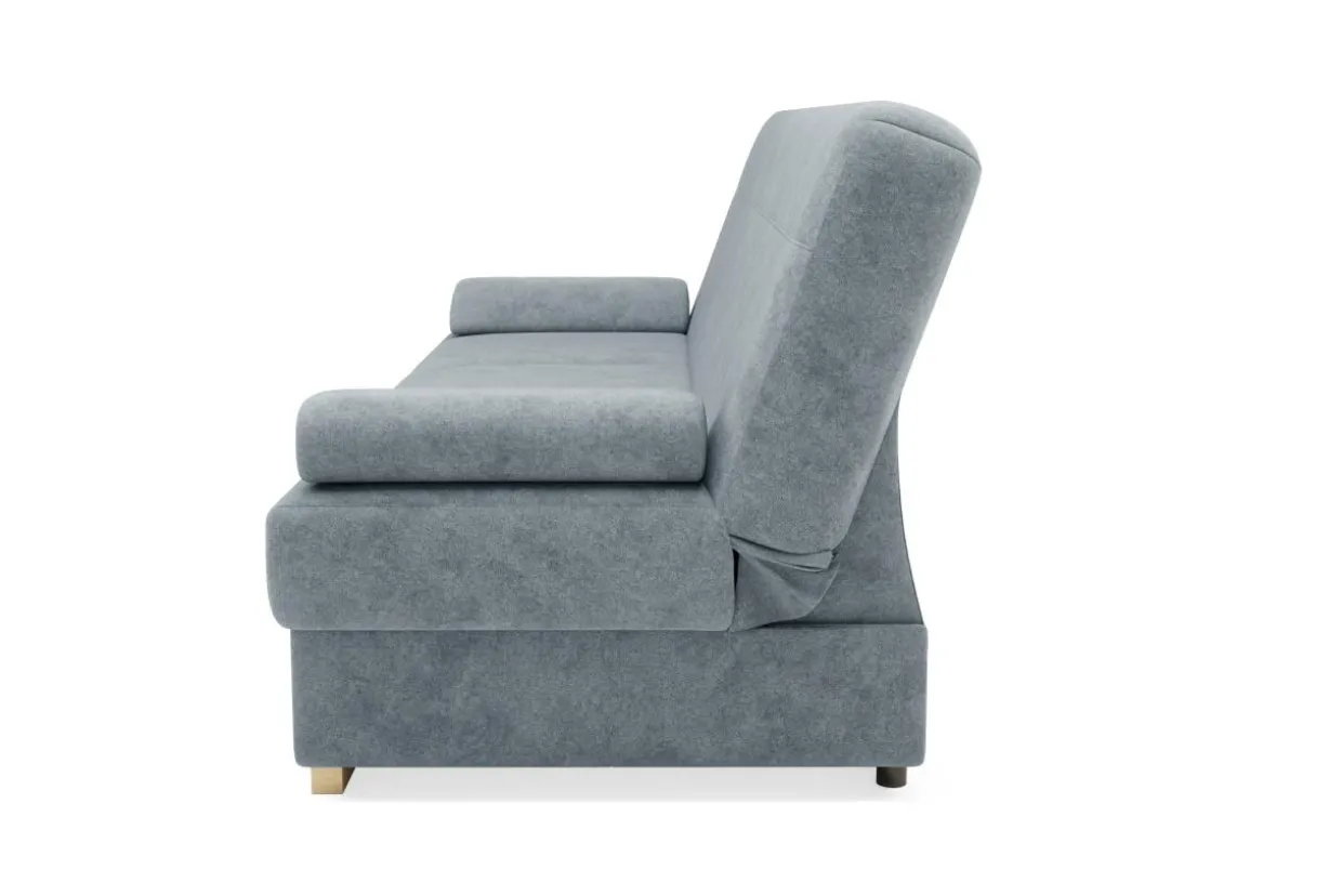 Przy szerokości jedynie 200 cm wersalka dysponuje praktyczną funkcją spania i pojemnikiem na pościel. Zamiast stałych podłokietników wykorzystano miękko wypełnione poduszki podłokietnikowe, których ściągnięcie zwiększa powierzchnię spania czy siedzenia. Poduszki te można podłożyć także pod głowę lub plecy.